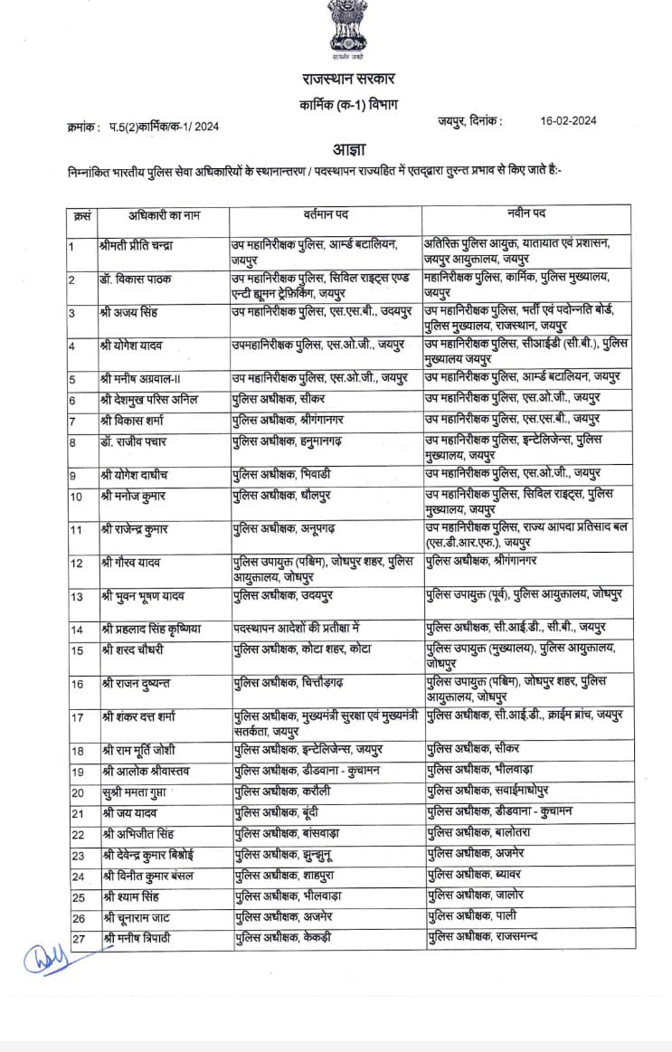 65 IPS Transfer in Rajasthan: 9DIG और 39 SP हुए इधर उधर