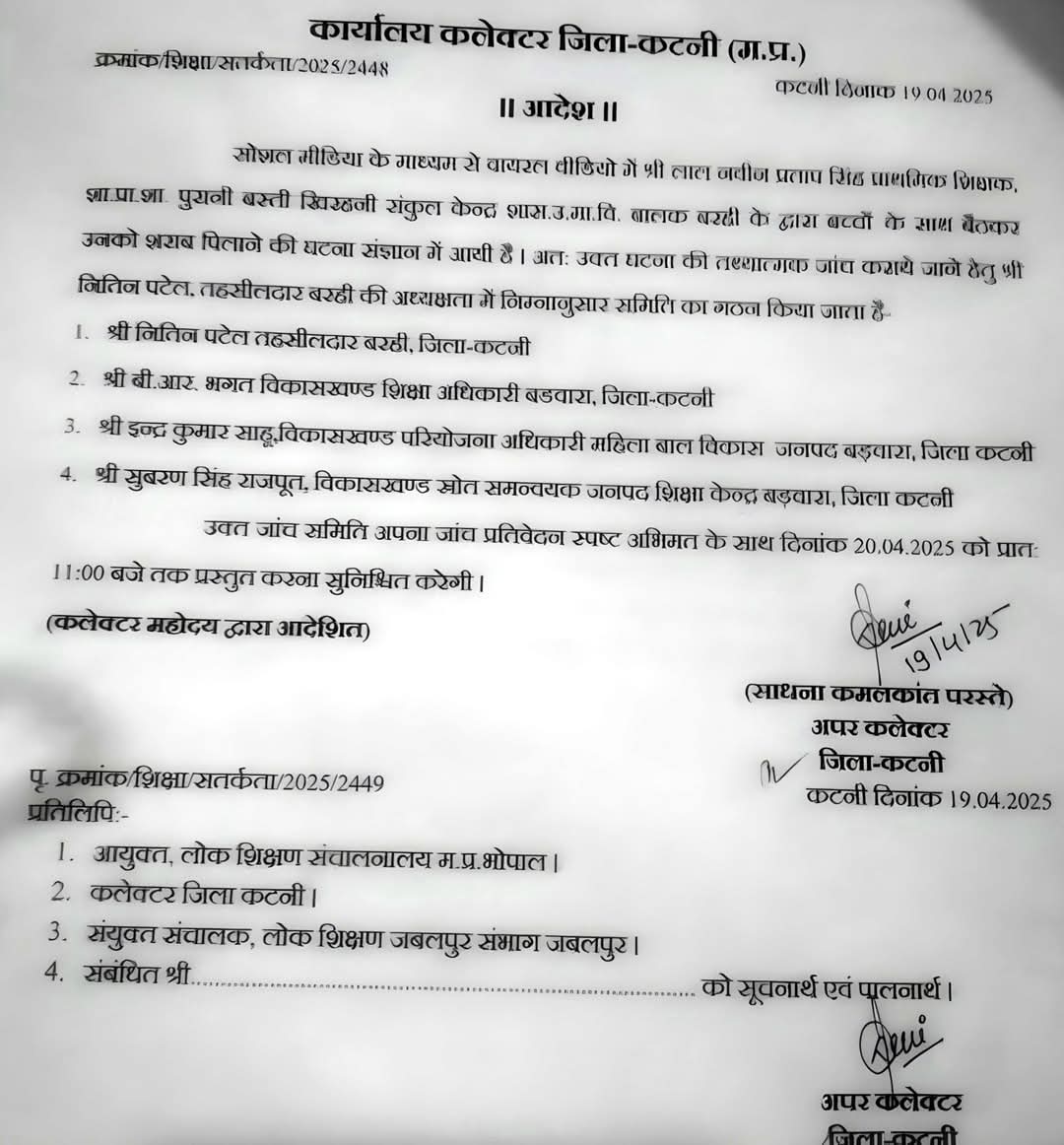 कटनी।शासकीय प्राथमिक शाला पुरानी बस्ती खिरहनी के प्राथमिक शिक्षक श्री लाल नवीन प्रताप सिंह द्वारा बच्चों के साथ बैठकर शराब पिलाने और शराब पीने हेतु प्रेरित करने के मामले की तथ्यात्मक जांच हेतु कलेक्टर श्री दिलीप कुमार यादव के निर्देश पर चार सदस्यीय जांच दल गठित किया गया है।