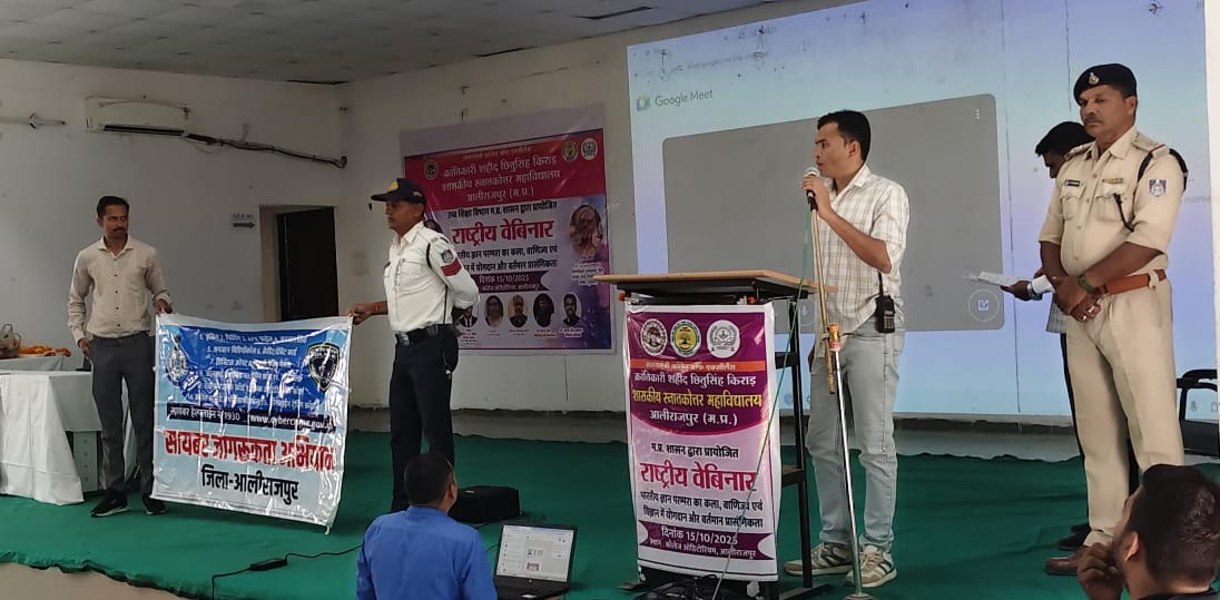 ALIRAJPUR: राष्ट्रीय सायबर सुरक्षा जागरूकता माह (NCSAM-2025) के अंतर्गत अलीराजपुर पुलिस द्वारा पी.जी. कॉलेज ऑडिटोरियम, आलीराजपुर में एक विशेष जनजागरूकता कार्यक्रम आयोजित किया गया। कार्यक्रम में विद्यार्थियों को सायबर सुरक्षा और यातायात नियमों की जानकारी एक साथ देकर यह बताया गया कि “सुरक्षा” केवल सड़क की नहीं, बल्कि डिजिटल दुनिया की भी उतनी ही जरूरी है।