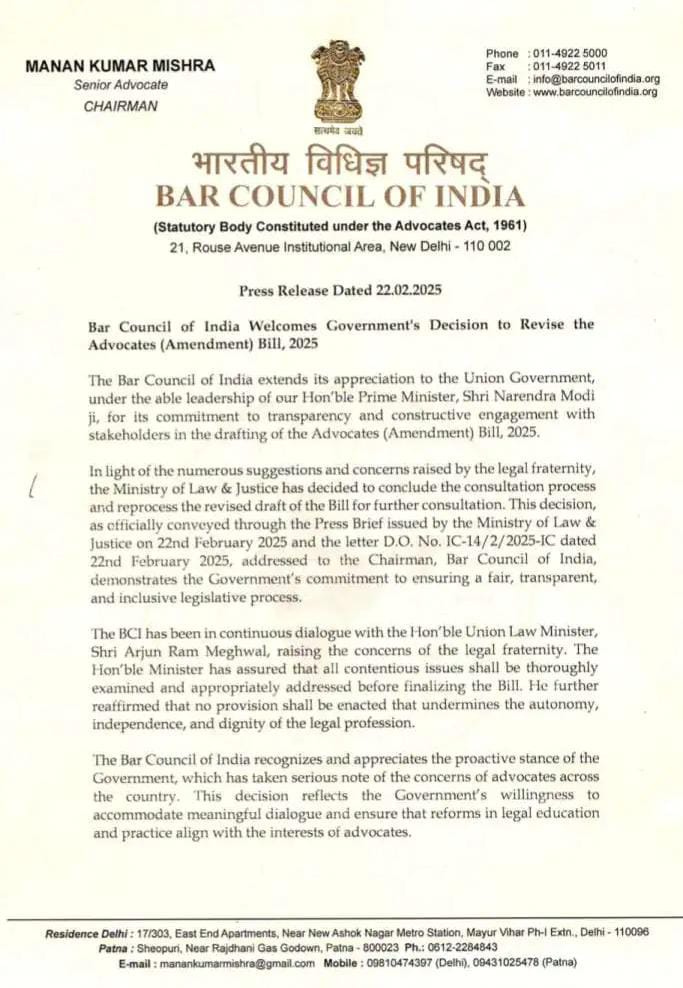 New Delhi : एडवोकेट अमेंडमेंट बिल 2025 के विरुद्ध वकीलों की आपत्तियों पर विचार करने के बाद सरकार ने इस बिल को पुनर्विचार के लिए वापस लेने का फैसला लिया। एडवोकेट अमेंडमेंट बिल 2025 के विरोध में देशभर के वकीलों के विरोध-प्रदर्शन और हड़तालों के बाद अंततः शनिवार को केन्द्र सरकार ने एडवोकेट अमेंडमेंट बिल-2025 को वापस लेने की घोषणा की। अब इस पर नए सिरे से विचार किया जाएगा। इस घोषणा के बाद वकीलों ने भी इस बिल के विरोध में की जा रही हड़ताल समाप्त करने की घोषणा की। बार कौंसिल आफ इंडिया ने एडवोकेट अमेंडमेंट बिल 2025 को पुनर्विचार के लिए वापस लेने के निर्णय का स्वागत किया है।