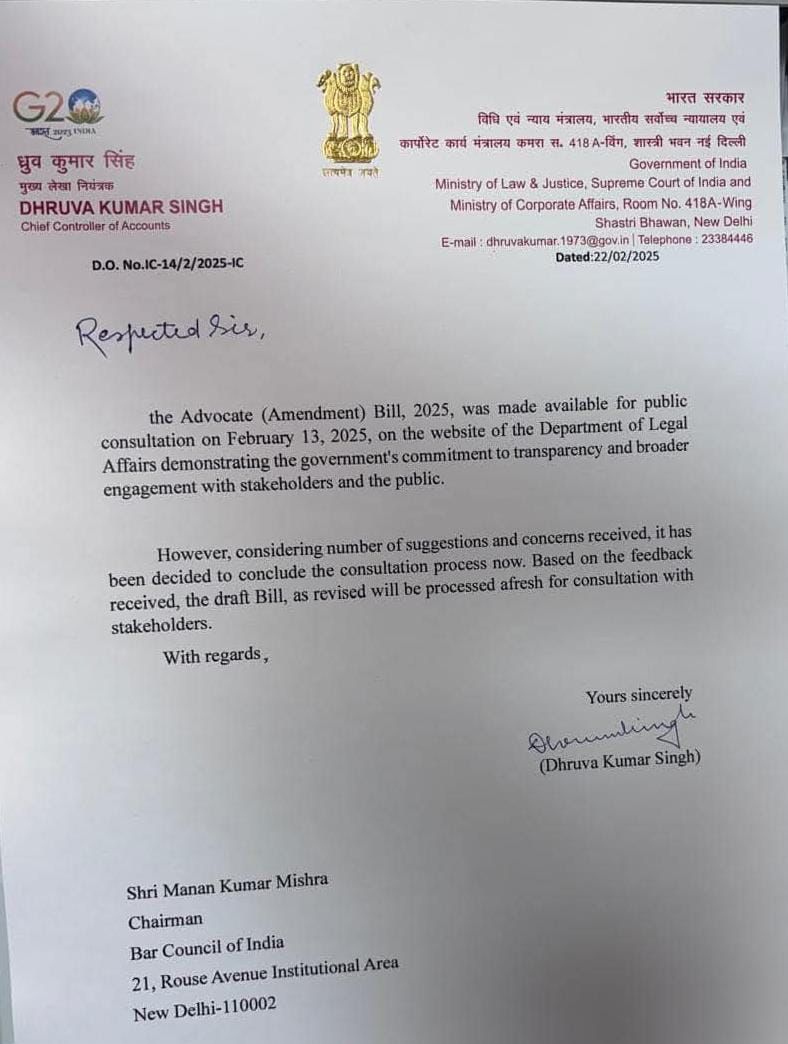 केंद्र सरकार के विधि मंत्रालय के विधि मामलों के विभाग की और से सार्वजनिक परामर्श और आम लोगों के सुझाव प्राप्त करने के लिए दिनांक 13 फरवरी 2025 को एडवोकेट अमेंडमेंट बिल 2025 का मसौदा विधेयक जारी कर उस पर सुझाव मांगे गए थे। लेकिन, मसौदे में वकील विरोधी अनेक प्रावधान को देखते ही वकीलों ने इस बिल का विरोध करना शुरू कर दिया। वकीलों के विरोध प्रदर्शन और हड़तालों के बाद केंद्र सरकार ने बिल पुनर्विचार के लिए वापस लेने की घोषणा कर दी। सरकार ने बिल के सम्बन्ध में सुझाव दावा / आपत्ति की प्रक्रिया भी बन्द कर दी।