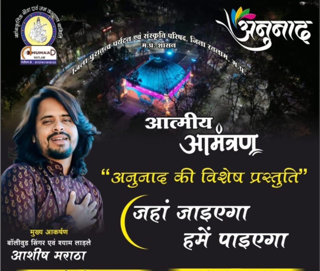 Ratlam : शहर के नवनिर्मित गुलाब चक्कर में शनिवार रात्रि को शहर में संगीत की प्रतिभाओं को प्रोत्साहित करने वाली संस्था ‘अनुनाद‘ के बेनर तले 13 सितंबर, को शाम 7 बजे गुलाब चक्कर पर ‘जहां जाइएगा, हमें पाइएगा‘ संगीत निशा का आयोजन किया जा रहा है। संस्था के अध्यक्ष अजीत जैन ने बताया कि कार्यक्रम में बालीवुड सिंगर आशीष मराठा सहित स्थानीय कलाकारों की प्रस्तुति विशेष रूप से होंगी।