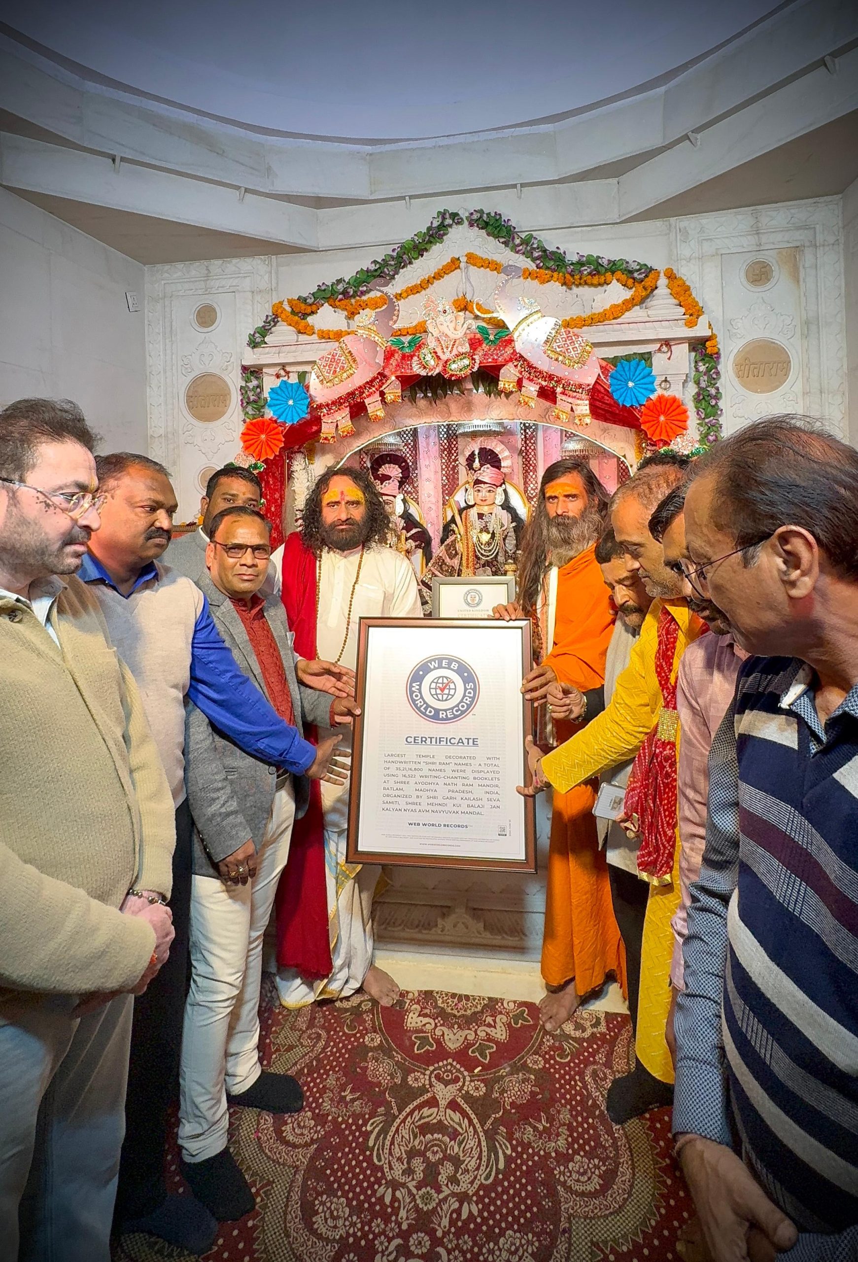 मंगलवार रात 7-30 बजे वेब वर्ल्ड जूरी मेंबर शैलेन्द्र सिंह सिसोदिया, जीतू नारायण यादव, रमेश सोनी पत्रकार, पियूष कल्याने, चंचल चौहान, विशाल वर्मा तथा चेतन सिंह द्वारा भगवान श्रीराम-जानकी के समक्ष मां बगलामुखी देवी के आराधक विख्यात संत श्री-श्री संस्कार ऋषि दिनेश जी व्यास गुरुजी तथा संत समाज के आतिथ्य तथा कर-कमलों से आयोजक शैलेन्द्र सोनी, अशोक चोटाला, सतीश राठौड़, सतीश चन्द्र भारतीय को द लंदन बुक ऑफ वर्ल्ड रिकॉर्ड और वेब ऑफ वर्ल्ड रिकॉर्ड का प्रमाण-पत्र देकर सम्मानित किया।
