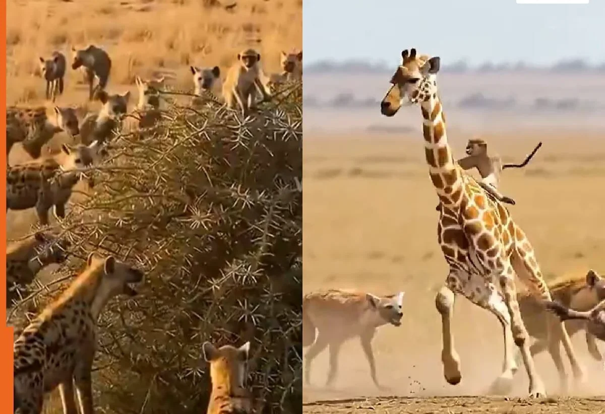 जिराफ का अचानक आगमनतभी अचानक एक जिराफ वहां पहुंचा. मानो भगवान ने ही उसे भेजा हो. लकड़बग्घे जैसे ही झाड़ी पर चढ़ने वाले थे, जिराफ ने अपनी लंबी गर्दन झुकाई और बंदर के बच्चे को अपनी पीठ पर चढ़ने का मौका दिया. बंदर ने फुर्ती से जिराफ की पीठ पर चढ़ गया. जिराफ ने उसे उठाया और वहां से भागने लगा. लकड़बग्घे हैरान रह गए और पीछे दौड़ने लगे, लेकिन जिराफ की लंबी टांगों के सामने वो कुछ नहीं कर पाए.