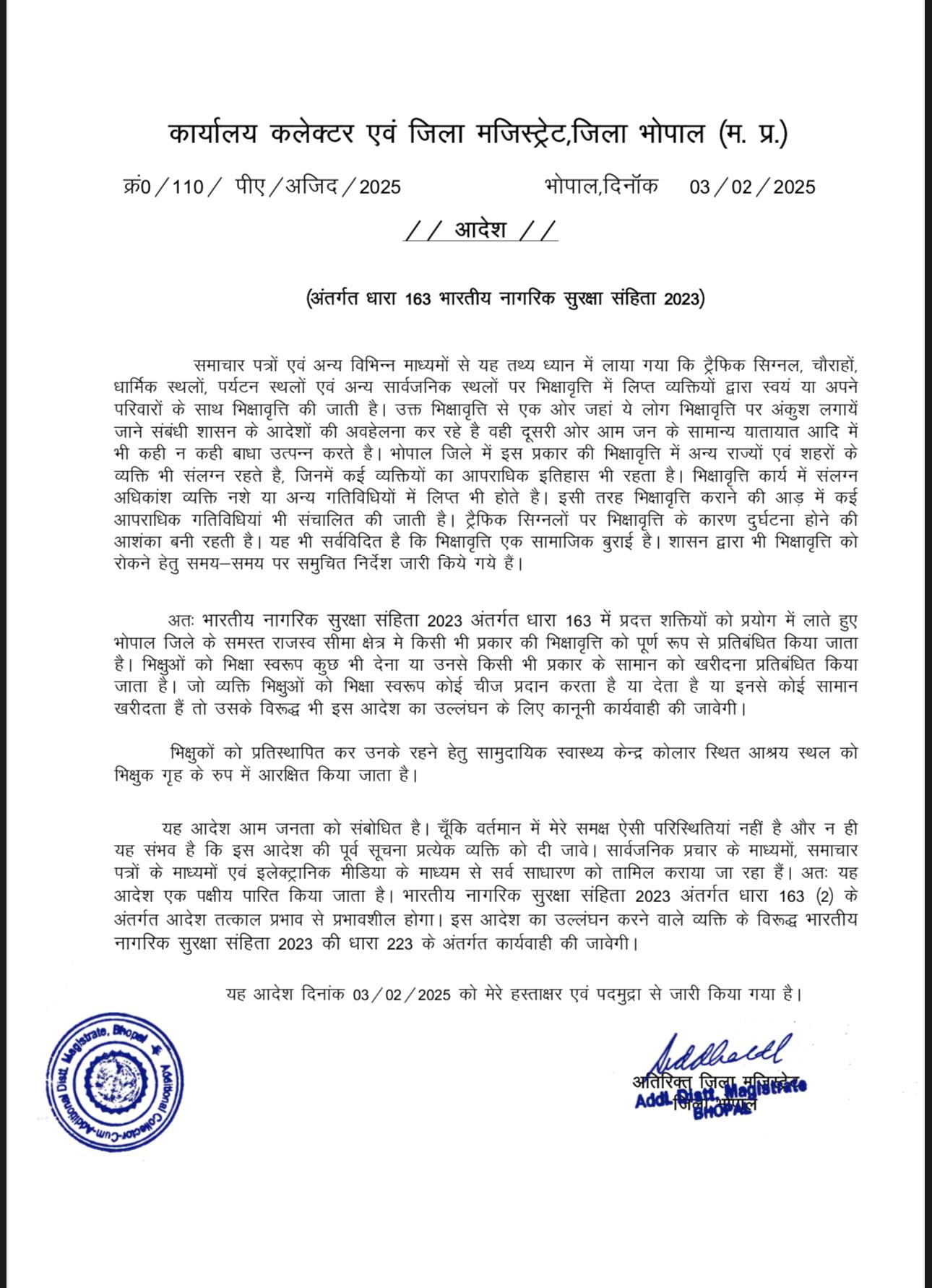 Bhopal News: कलेक्टर द्वारा भोपाल जिले में भिक्षावृत्ति पूर्ण रूप से प्रतिबंधित,भारतीय नागरिक सुरक्षा संहिता 2023 की धारा 163 के अंतर्गत प्रतिबंधात्मक आदेश जारी