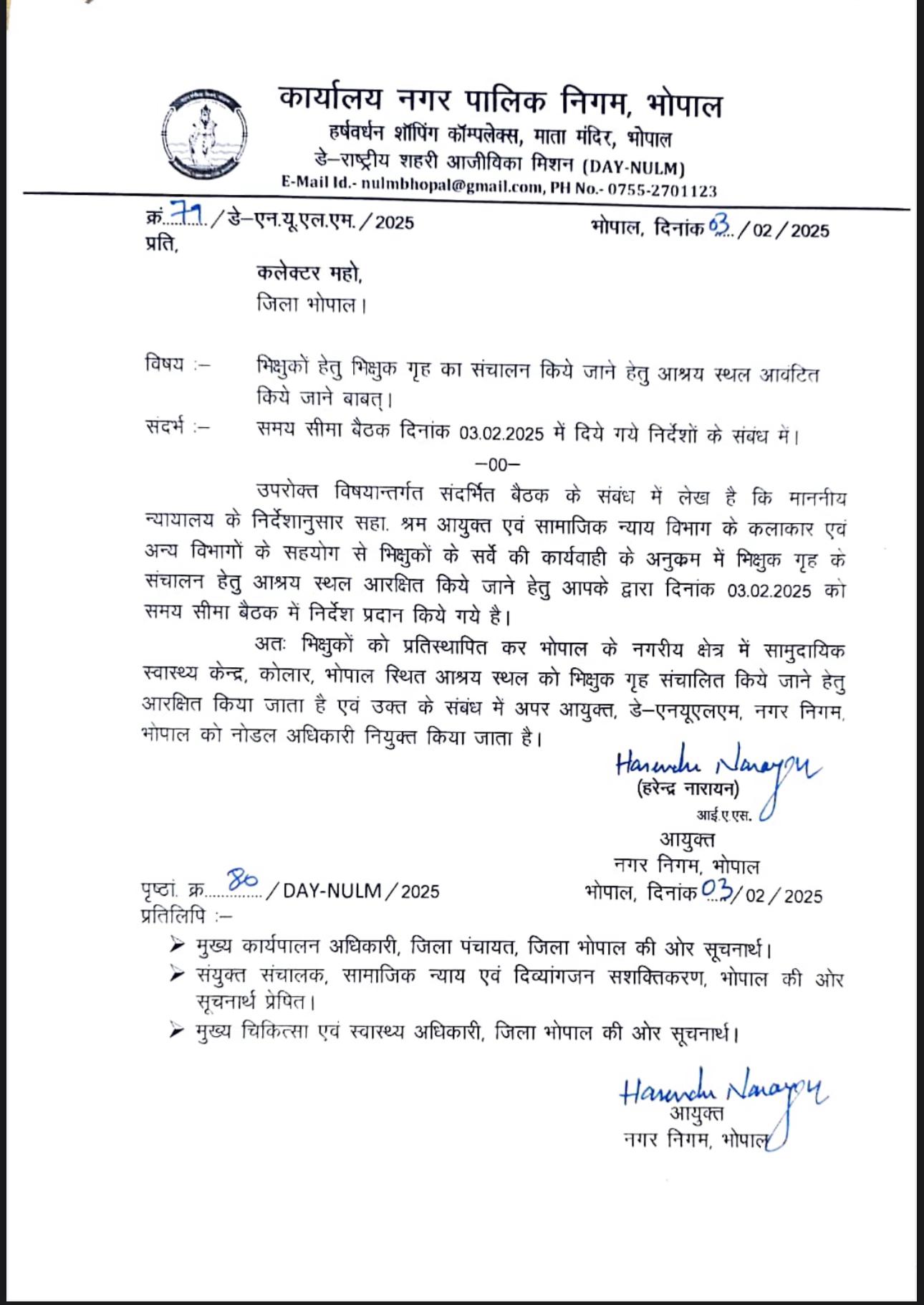 इसी संबंध मेंआयुक्त नगर निगम भोपाल हरेन्द्र नारायण ने कलेक्टर के निर्देश अनुसार भोपाल के नगरीय क्षेत्र में सामुदायिक स्वास्थ्य केन्द्र, कोलार स्थित आश्रय स्थल को भिक्षुक गृह संचालित किये जाने के लिए आरक्षित किया है।