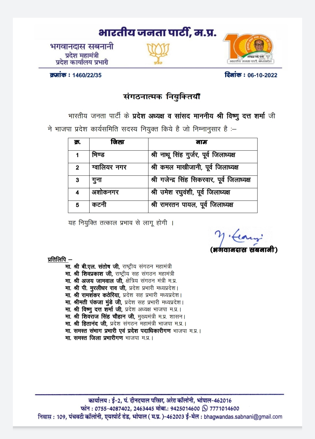 भिंड में देवेंद्र नरवरिया, ग्वालियर नगर में अभय चौधरी,गुना में धर्मेंद्र सिकरवार, अशोकनगर में आलोक तिवारी और कटनी में दीपक सोनी को नया जिला अध्यक्ष बनाया गया है।