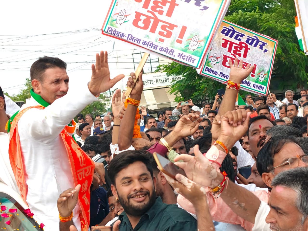 मंदसौर में बीपीएल स्थित सरदार पटेल प्रतिमा से कार्यकर्ताओं के साथ गांधी चौराहा पहुंचे और गांधी प्रतिमा पर माल्यार्पण कर पैदल मार्च में एनएसयूआई,युवा कांग्रेस,सेवादल व महिला कार्यकर्ता व पार्टी के कई अनुषंगी संगठन के पदाधिकारी व आमजन वोट चोर गद्दी छोड़ की तख्तियां व पार्टी के झंडे हाथों हाथों में लेकर पैदल मार्च में साथ चल रहे थे । जनसभा में पहुंच ने से पहले गांधी चौराहा स्थित राष्ट पिता महात्मा गांधी की मुर्ति पर श्री जीतु पटवारी ने माल्यापर्ण किया वही मंच पर श्री जितु पटवारी का सुत की माला से जिला कांग्रेस अध्यक्ष श्री महेन्द्रसिंह गुर्जर, विधायक श्री विपीन जैन, पूर्व विधायक नवकृष्ण पाटील ने स्वागत किया।
