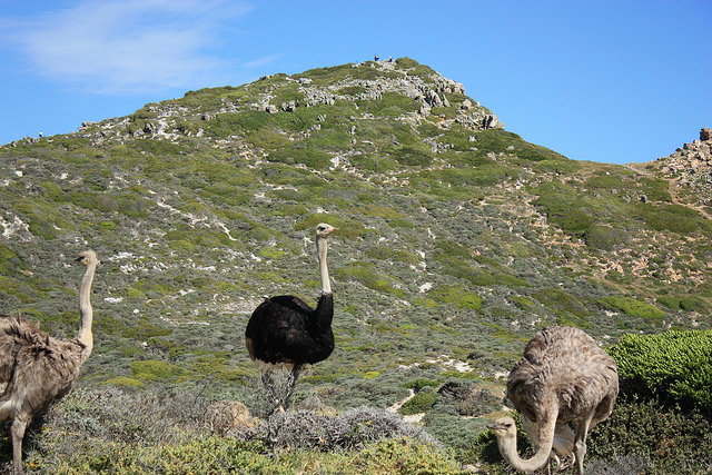 हम आगे निकल जाते हैं, सारा रास्ता प्रकृति का कोई खुद ही बनाया चित्र लगता है| पहली बार विदेशी वॉलपेपर के दृश्य याद आए ओह! तो वो जरूर यहीं की फोटोग्राफी होगी? दक्षिण अफ्रीका के पहाड़ मुझे पुराने ज्वालामुखी से निकले हुए लावा से निर्मित लगते हैं| अफ्रीका महाद्वीप ऊँचे पठारों का महाद्वीप है, इसका निर्माण अत्यन्त प्राचीन एवँ कठोर चट्टानों से हुआ है| बड़े पठारों के बीच अनेक छोटे-छोटे पठार विभिन्न ढाल वाले हैं| दक्षिणी अफ्रीका में पठार एवँ तट में बहुत ही कम अन्तर है, दोनों का साथ हर जगह बना हुआ है| यहाँ समुद्र जैसे तिलस्म रचता है| केप ऑफ गुड होप आने से पहले हमें कुछ जंगली जानवर मिलते हैं पर वे फुर्ती से भाग जाते हैं| सड़क के किनारे ऑस्ट्रिच भी जोड़े में घूमते हुए दिख जाते हैं जिन्हें हमने कांगो वैली में देख ही लिया था, पश्चिमी तट के अंतिम बिंदु या कह सकते हैं दुनिया के आखिरी छोर पर बस हम पहुँचने ही वाले हैं और सड़क पर समुद्र तट के पास कुछ झाड़ियों के बीच से एक बारहसिंगे जैसा कोई जानवर जोड़े से घूमता हुआ दिखाई देता है, ड्राइवर गाड़ी रोक कर दिखाता है| मैं लगभग चीखते हुए कहती हूँ वो देखो उसका प्यारा सा छोना?