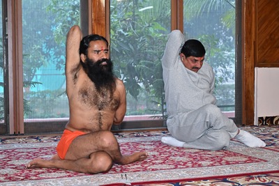 देखिए बाबा रामदेव और मुख्यमंत्री की अलग-अलग योग मुद्राएं