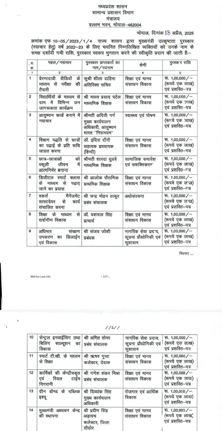मुख्यमंत्री उत्कृष्टता पुरस्कार: 2022-23 नवाचार श्रेणी के लिए चयनित 14 शासकीय अधिकारियों की सूची जारी