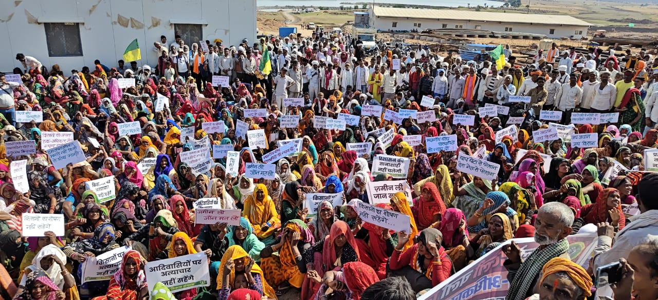 बिजावर अनुविभाग में चल रहे निर्माण कार्य को रोकने के लिए हजारों की संख्या में आदिवासी किसान, महिलाएं और ग्रामीण ढोढन बांध स्थल पर धरने पर बैठ गए हैं। प्रदर्शनकारियों ने काम कर रही मशीनों के सामने खड़े होकर निर्माण कार्य रुकवा दिया। खास बात यह रही कि आंदोलन में बड़ी संख्या में महिलाएं भी शामिल हैं, जो हाथों में तख्तियां लेकर “जल, जंगल, जमीन” की लड़ाई का ऐलान कर रही हैं।