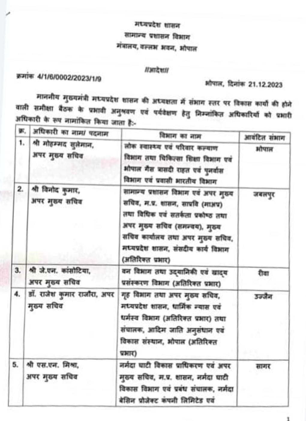 प्रदेश के सामान्य प्रशासन विभाग द्वारा इस संबंध में जारी आदेश के अनुसार अपर मुख्य सचिव मोहम्मद सुलेमान भोपाल संभाग,विनोद कुमार जबलपुर, जेएन कंसोटिया रीवा, डॉ राजेश कुमार राजोरा उज्जैन, एसएन मिश्रा सागर, मलय श्रीवास्तव इंदौर, अजीत केसरी नर्मदा पुरम, अशोक बर्णवाल शहडोल, मनु श्रीवास्तव चंबल और के सी गुप्ता को ग्वालियर संभाग का प्रभारी अधिकारी नामांकित किया गया है।