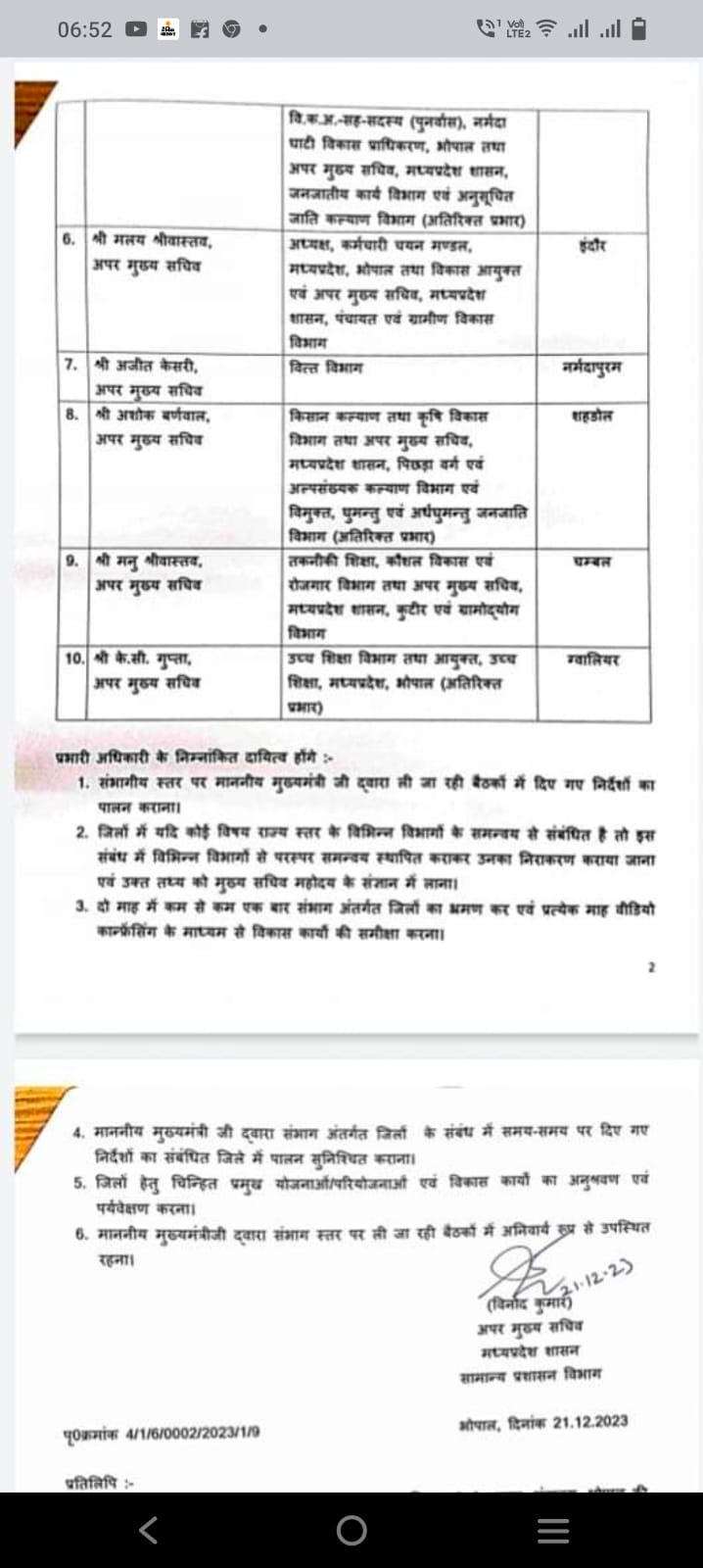 प्रभारी ACS यह भी सुनिश्चित करें कि मुख्यमंत्री द्वारा संभाग के जिलों के संबंध में समय-समय पर दिए निर्देश का पालन हो। इन अधिकारियों को जिलों के लिए चिन्हित प्रमुख योजनाओं, परियोजनाओं और विकास कार्यों की सतत मॉनिटरिंग भी करने का दायित्व सौंपा गया है।
