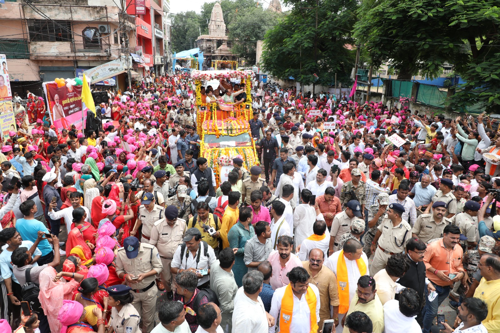 मुख्यमंत्री श्री शिवराज सिंह चौहान ग्वालियर की जन-दर्शन यात्रा में उमड़े अपार जन-समूहों ने पुष्प-वर्षा और ढोल-ढमाकों के साथ भव्य स्वागत किया। जन दर्शन यात्रा (रोड शो) के दौरान भारत माता की जय और वंदेमातरम के घोष के बीच आगे बढ़ते मुख्यमंत्री श्री चौहान के विकास रथ का घरों की छतों, स्वागत मंचों से पुष्प-वर्षा के साथ स्वागत होता रहा। सरकार की विभिन्न योजनाओं से लाभान्वित हितग्राहियों ने उत्साह के साथ मुख्यमंत्री श्री चौहान का स्वागत किया। मुख्यमंत्री श्री चौहान से जन दर्शन के दौरान लाड़ली लक्ष्मी, लाड़ली बहना सेना, संबल योजना से लाभान्वित हितग्राही, किसान सम्मान निधि से लाभान्वित हितग्राही, आयुष्मान कार्ड से लाभान्वित हितग्राही, स्व-सहायता समूहों की दीदियाँ, युवा उद्यमी व सीखो कमाओ योजना से लाभान्वित युवा, पीएम स्वनिधि से लाभान्वित हितग्राही, स्कूटी वितरण से लाभान्वित विद्यार्थी, उज्ज्वला गैस कनेक्शन से लाभान्वित हितग्राही और प्रधानमंत्री आवास योजना के लाभार्थियों ने भेंट की।