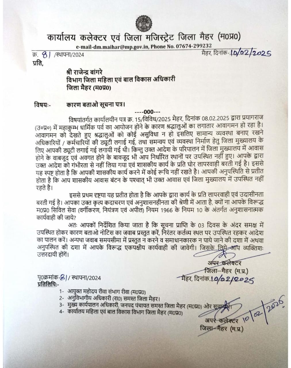 मैहर : मैहर कलेक्टर रानी बाटड ने प्रयागराज महाकुंभ मेले के दौरान ड्यूटी से नदारद रहने वाले महिला बाल विकास अधिकारी को नोटिस जारी किया है और 3 दिन दिन में जवाब मांगा है