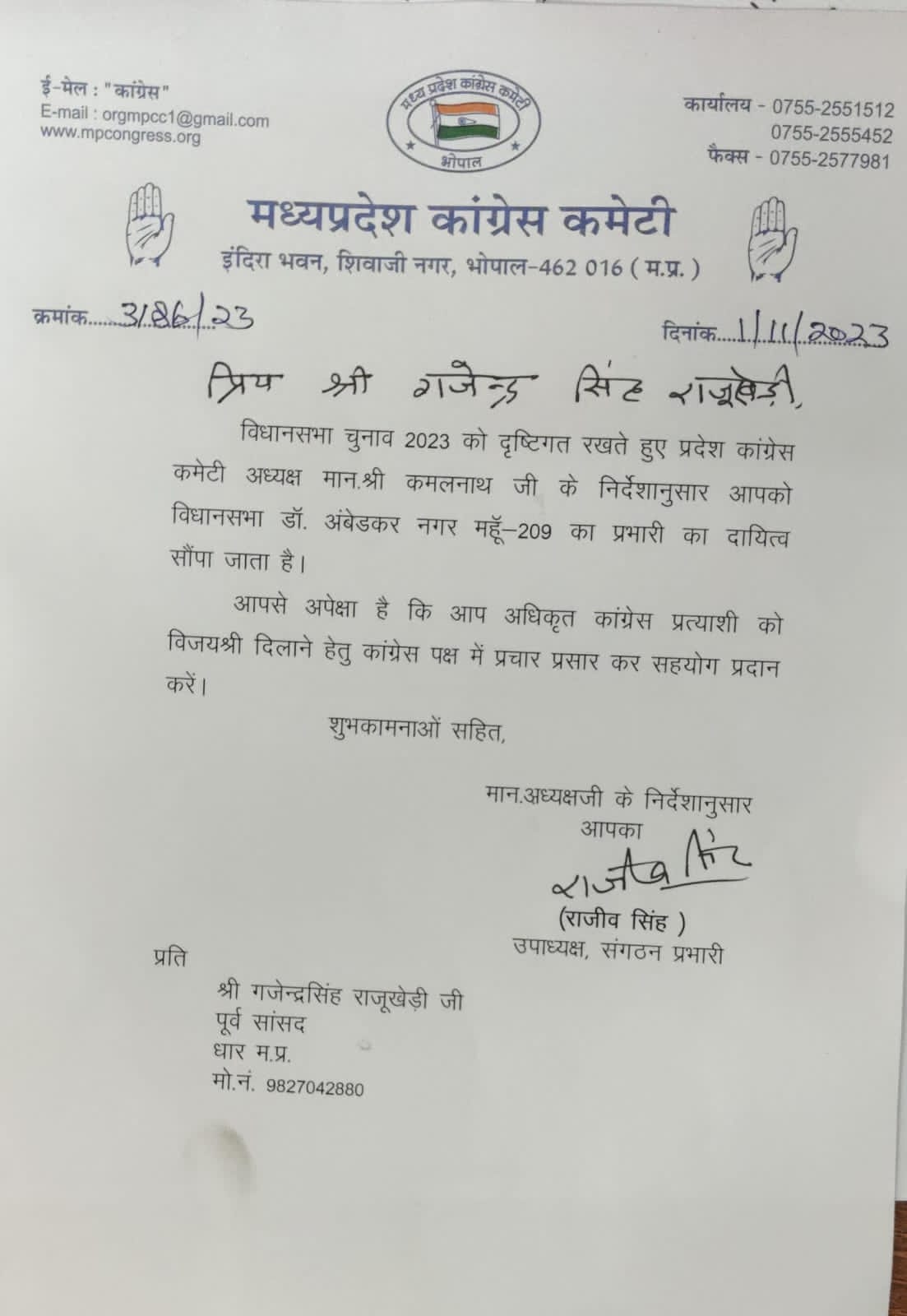 भोपाल: मध्य प्रदेश कांग्रेस द्वारा नाराज नेताओं को मनाने का क्रम अभी जारी है और उन्हें नए पदों से नवाजा जा रहा है। इसी क्रम में मध्य प्रदेश कांग्रेस क्या अध्यक्ष कमलनाथ ने डॉक्टर अंबेडकर नगर महू विधानसभा क्षेत्र का प्रभारी पूर्व सांसद गजेंद्र सिंह राजू खेड़ी को बनाया है।