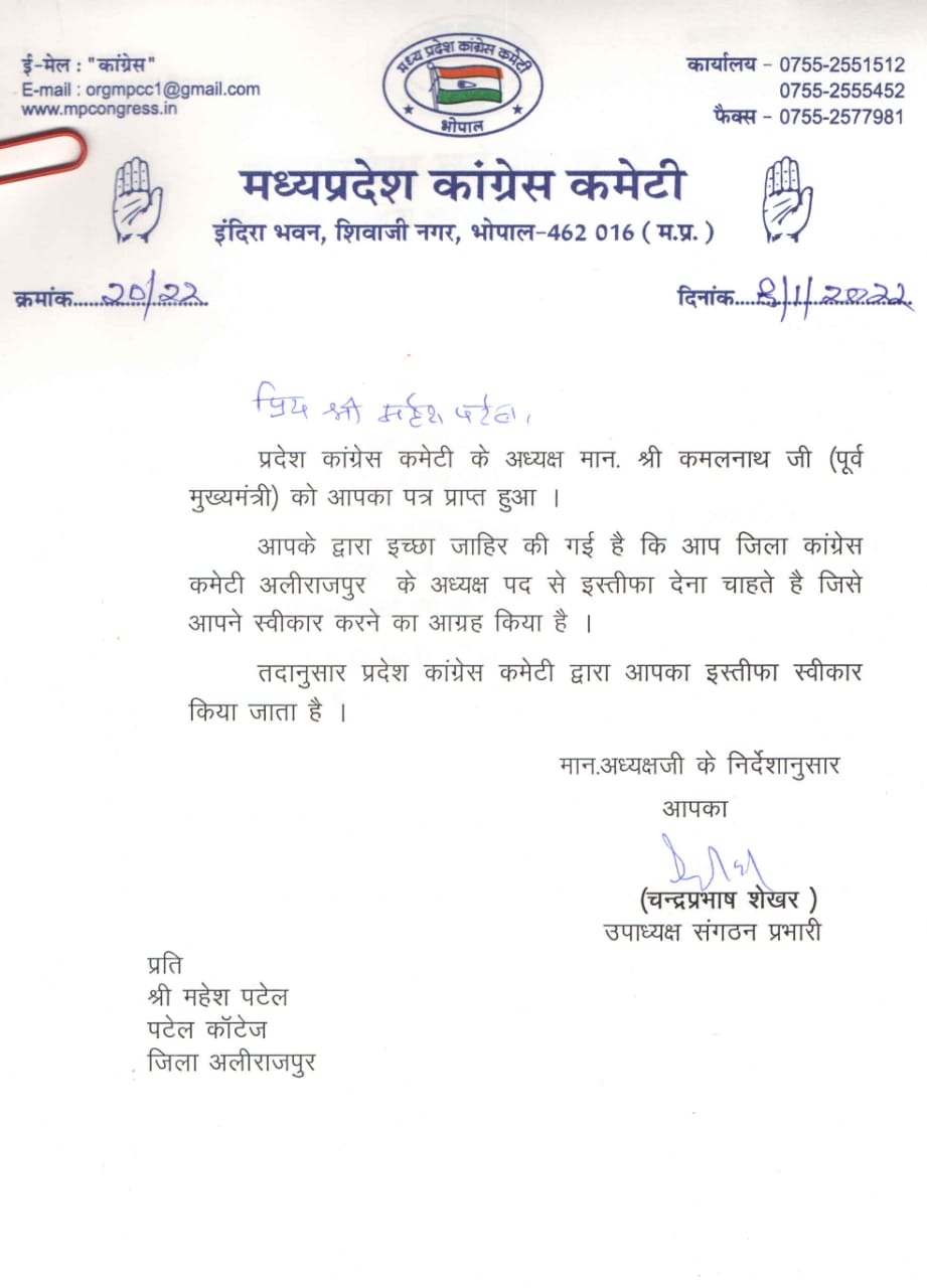 आज इस मुद्दे का महत्वपूर्ण मोड़ यह है कि महेश पटेल ने जिला कांग्रेस अध्यक्ष पद से इस्तीफा दे दिया, जिसे प्रदेश कांग्रेस ने स्वीकार कर लिया।
