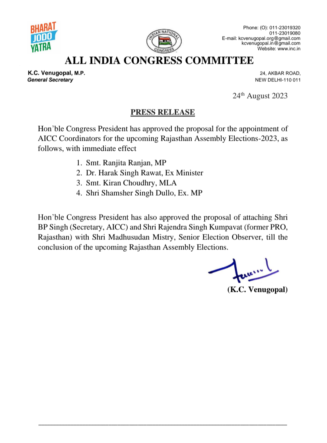 नई दिल्ली।कांग्रेस अध्यक्ष मल्लिकार्जुन खड़गे ने आगामी राजस्थान विधानसभा चुनाव-2023 के लिए नियुक्त वरिष्ठ चुनाव पर्यवेक्षक मधुसूदन मिस्त्री के साथ दो सहयोगियों एआईसीसी के सचिव बी.पी. सिंह और राजस्थान के पूर्व पीआरओ राजेंद्र सिंह कुंपावत की नियुक्ति की है।