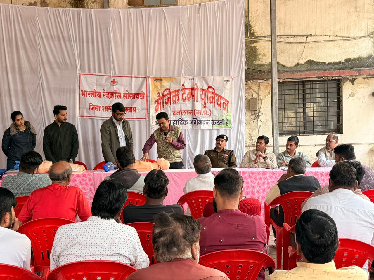 Ratlam : भारतीय रेडक्रॉस सोसायटी द्वारा जिलाधीश मिशा सिंह के मार्गदर्शन में चल रहें सीपीआर ट्रेंनिंग प्रोग्राम के अंतर्गत चेयरमैन प्रीतेश गादिया के नेतृत्व में दो बत्ती पुलिस थाने पर कार्यक्रम आयोजित किया। कार्यक्रम में अतिथि ट्रैफिक डीएसपी आनंद सोनी ने कहा की यह ट्रेनिंग मैजिक संगठन के समस्त चालकों के लिए एवं ट्रैफिक से जुड़े हर व्यक्ति के लिए अति आवश्यक हैं जो की चलते यात्री की किसी भी वक्त जीवन बचाने के काम आ सकती है।