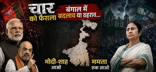 पश्चिम बंगाल चुनाव में 23 अप्रैल 2026 को पहले चरण में रिकॉर्ड वोटिंग के बाद अब दूसरे चरण में 142 सीटों पर 29 अप्रैल को मतदान होगा। प्रधानमंत्री नरेंद्र मोदी और अमित शाह ने 24 अप्रैल 2026 को चुनावी रैली को संबोधित करते हुए टीएमसी प्रमुख ममता बनर्जी पर शब्दों से वार कर कहा कि बंगाल की जनता ने परिवर्तन की लहर पर मुहर लगा दी है। बंगाल में भय पर भरोसे की जीत हो चुकी है। पश्चिम बंगाल की 294 सीटों में से 152 सीटों पर पहले फेज में 92 फीसदी से अधिक मतदान हुआ। वहीं, तमिलनाडु की सभी 234 सीटों पर 85 फीसदी से अधित वोटिंग हुई है। बंगाल में ममता बनर्जी तृणमूल कांग्रेस के लिए चौथी बार सत्ता बचाने की जंग लड़ रही हैं। तो ममता की उम्मीदों को निर्ममता से कुचलने का मन मोदी-शाह बना चुके हैं। ममता पर मोदी के आरोप हैं कि टीएमसी महिला विरोधी पार्टी है। टीएमसी ने लोकतंत्र के मंदिर को कुचल दिया था। मोदी ने कहा कि बंगाल की जनता ने परिवर्तन की लहर पर मुहर लगा दी है। दूसरे चरण में विजय ध्वज फहराना है। बंगाल ने लोकतंत्र के मंदिर का पुनर्निमाण किया है। शाह के मुताबिक, लोगों ने बिना डर के रिकॉर्ड मतदान किया है और यह बदलाव के पक्ष में जनादेश है। उन्होंने कहा कि बंगाल में अब “भय से भरोसे” की यात्रा जारी है और परिवर्तन तय है।