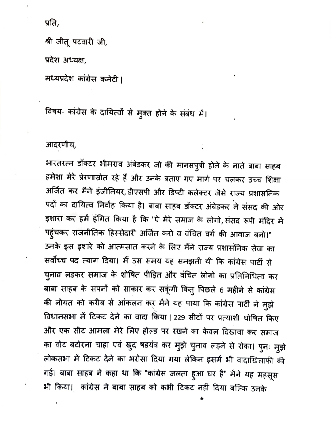 भोपाल: मध्य प्रदेश की चर्चित पूर्व डिप्टी कलेक्टर और कांग्रेस की मुख्य प्रवक्ता निशा बांगरे ने आज अंबेडकर जयंती पर उनका स्मरण करते हुए कांग्रेस से इस्तीफा दे दिया है। मध्य प्रदेश कांग्रेस अध्यक्ष जीतू पटवारी को भेजें अपने पत्र में उन्होंने कहा कि वे कांग्रेस के सभी दायित्व से मुक्त हो रही है।