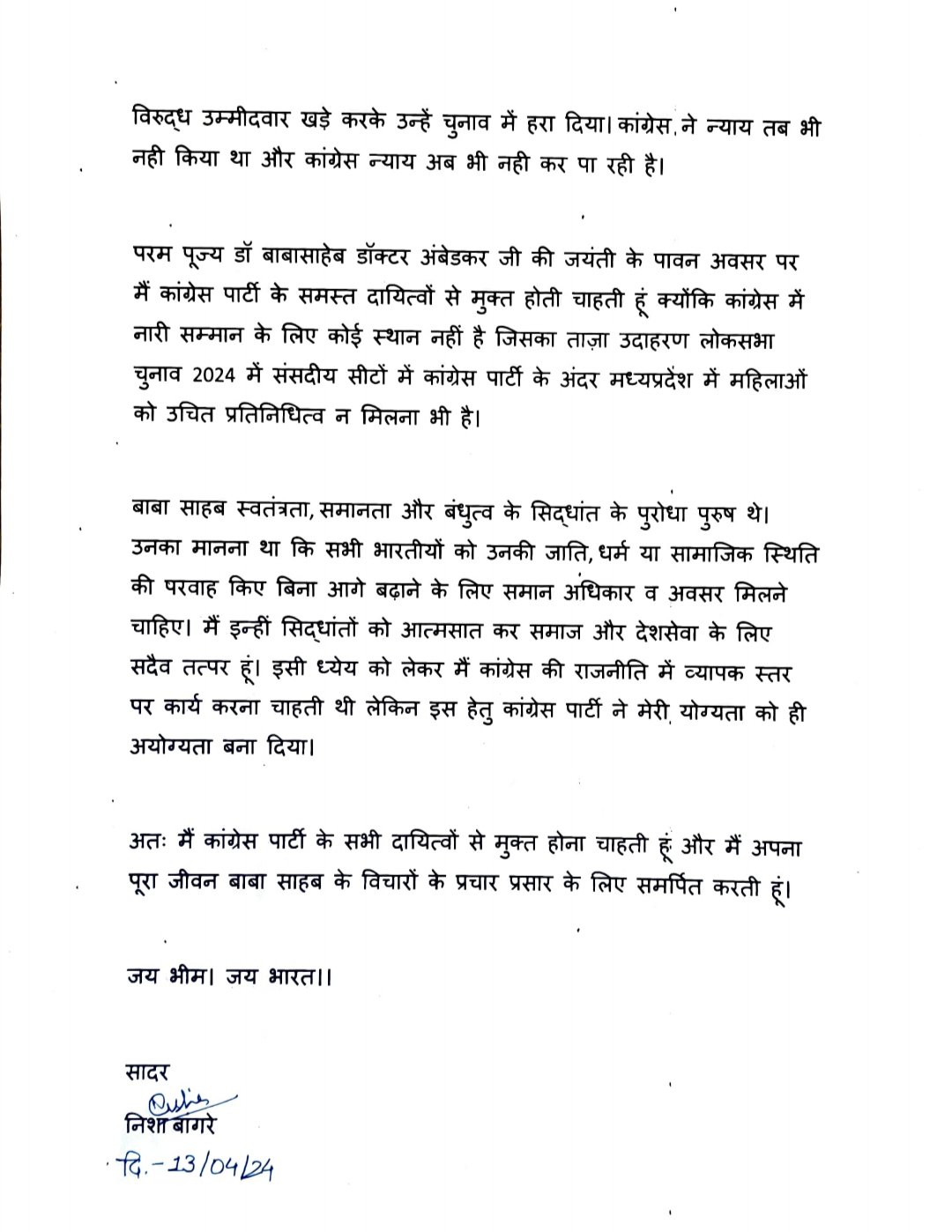 निशा ने कहा कि डॉक्टर बाबा साहब अंबेडकर की जयंती के पावन अवसर पर मैं कांग्रेस पार्टी के समस्त दायित्वों से मुक्त होना चाहती हूं क्योंकि नारी सम्मान का कांग्रेस में कोई स्थान नहीं है जिसका ताजा उदाहरण लोकसभा चुनाव में संसदीय सीटों में कांग्रेस पार्टी के अंदर मध्य प्रदेश में महिलाओं को उचित प्रतिनिधित्व न मिलना भी है।