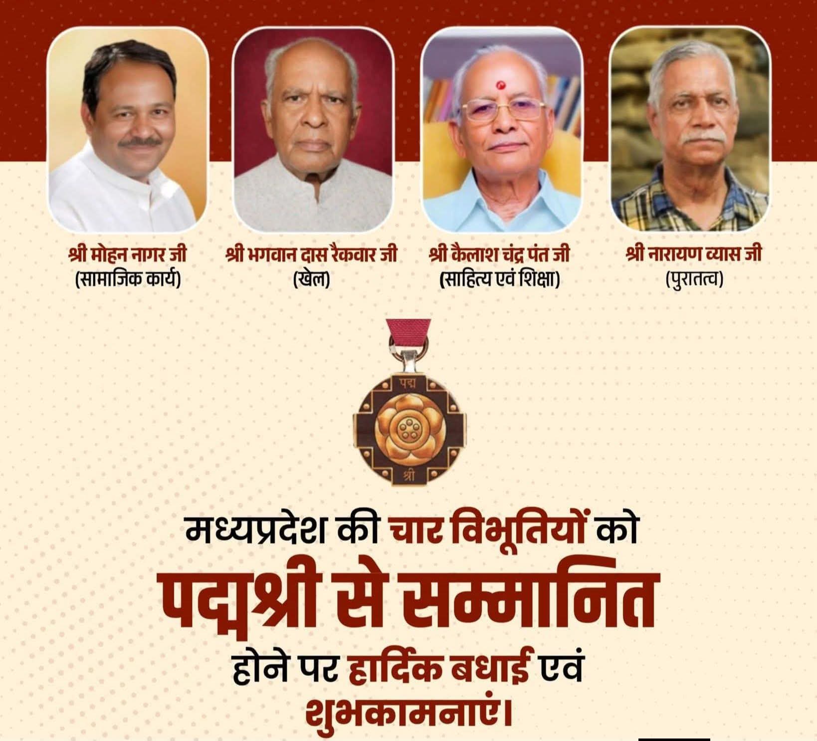 BHOPAL: मध्यप्रदेश की चार विशिष्ट विभूतियों को उनके-अपने कार्यक्षेत्र में उल्लेखनीय और दीर्घकालिक योगदान के लिए राष्ट्रीय स्तर पर सम्मानित किया गया है। सामाजिक सेवा, साहित्य एवं शिक्षा, खेल तथा पुरातत्व जैसे महत्वपूर्ण क्षेत्रों में निरंतर समर्पण और उत्कृष्ट कार्य के माध्यम से इन व्यक्तित्वों ने न केवल समाज को दिशा दी है, बल्कि मध्यप्रदेश का नाम भी राष्ट्रीय पटल पर गौरवान्वित किया है। यह सम्मान प्रदेश की रचनात्मक, बौद्धिक और सांस्कृतिक क्षमता का प्रतीक है और हम सभी प्रदेशवासियों के लिए गर्व का विषय है।