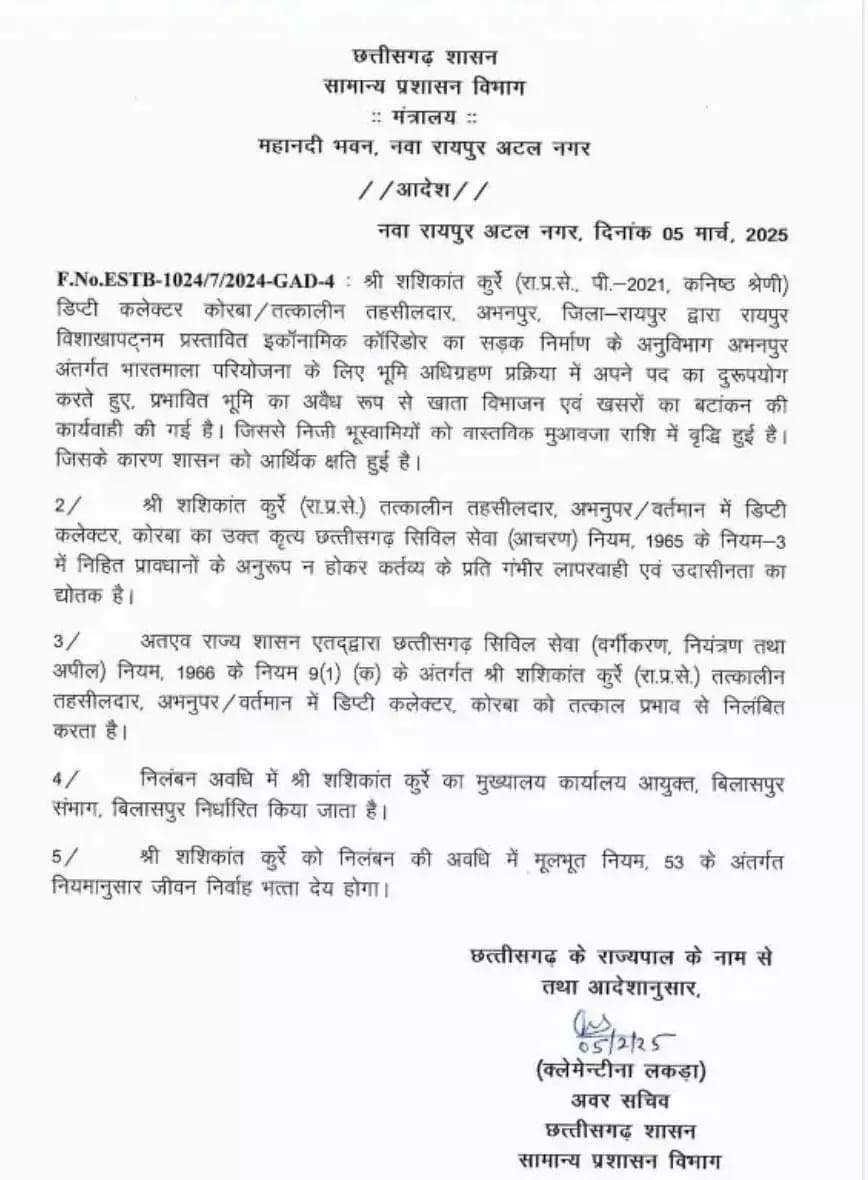 इस संबंध में जारी आदेश में बताया गया है कि 2021 बैच के राज्य प्रशासनिक सेवा के प्रमोटी अधिकारी कुर्रे को, जब वे अभनपुर जिला रायपुर में तहसीलदार थे, द्वारा रायपुर विशाखापट्टनम प्रस्तावित इकोनामिक कॉरिडोर का सड़क निर्माण के अनुविभाग अभनपुर अंतर्गत भारतमाला परियोजना के लिए भूमि अधिग्रहण प्रक्रिया में अपने पद का दुरुपयोग करते हुए प्रभावित भूमि का अवैध रूप से खाता विभाजन एवं खसरों के आवंटन की कार्रवाई की गई जिससे निजी भूस्वामियों को वास्तविक मुआवजा राशि में वृद्धि हुई है। इससे शासन को आर्थिक क्षति हुई है।