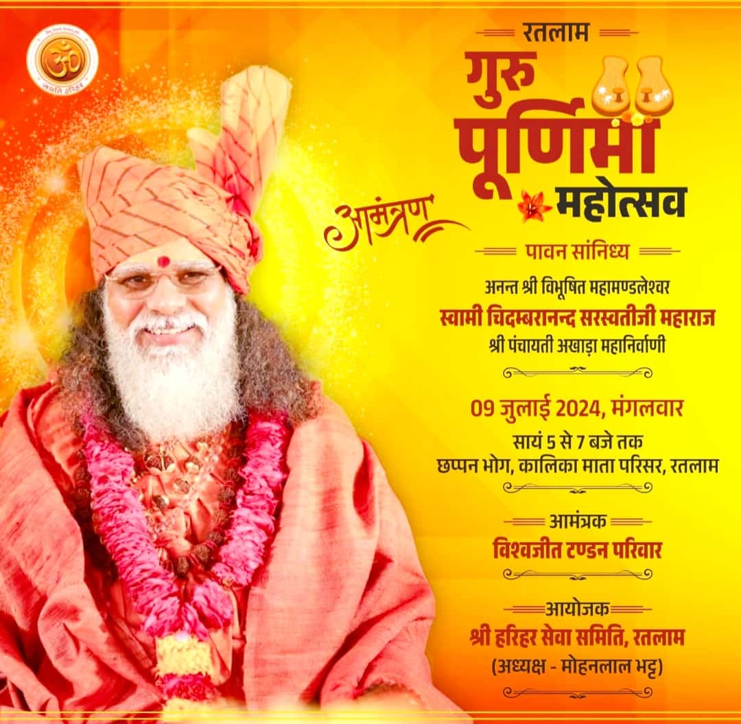 Ratlam : श्री कालिका माता मंदिर क्षेत्र में महामंडलेश्वर पूज्यपाद स्वामीश्री चिदम्बरानन्द सरस्वतीजी महाराज के सानिध्य में गुरु पूर्णिमा महोत्सव मंगलवार को मनाया जाएगा।