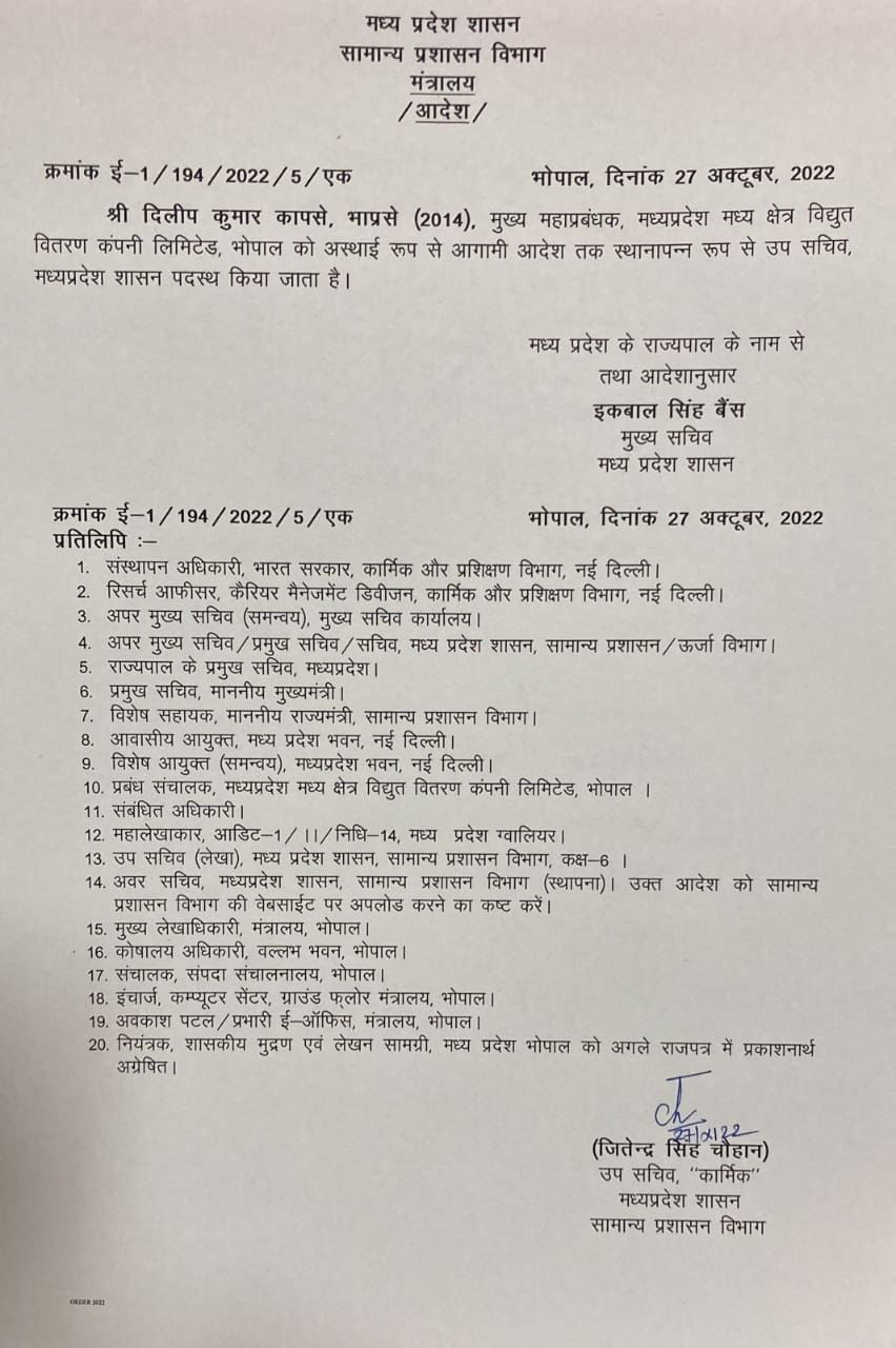 भोपाल: राज्य शासन ने आज एक आदेश जारी कर IAS अधिकारी दिलीप कुमार कापसे मुख्य महाप्रबंधक मध्य प्रदेश मध्य क्षेत्र विद्युत वितरण कंपनी लिमिटेड भोपाल को उप सचिव मध्य प्रदेश शासन पदस्थ किया है।