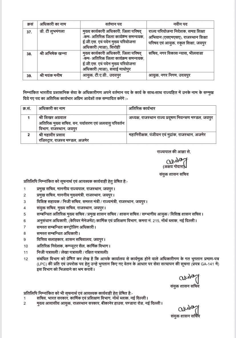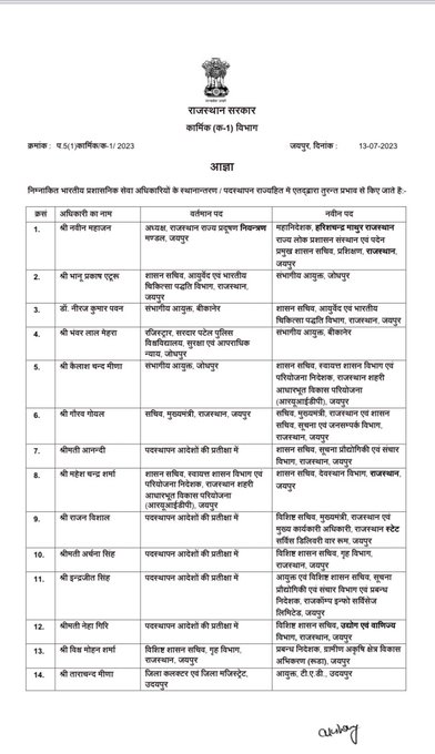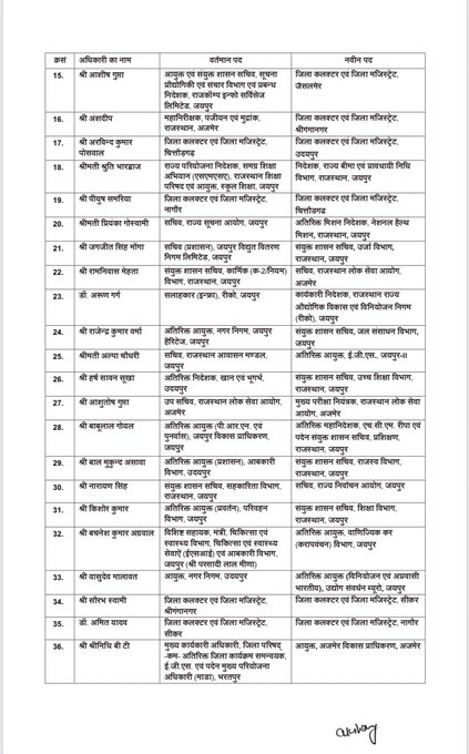 जयपुर: राजस्थान सरकार ने कल देर रात 39 IAS अधिकारियों की तबादला सूची जारी की है। इस सूची में 6 कलेक्टरों के साथ ही दो कमिश्नर के तबादले भी किए गए हैं।
