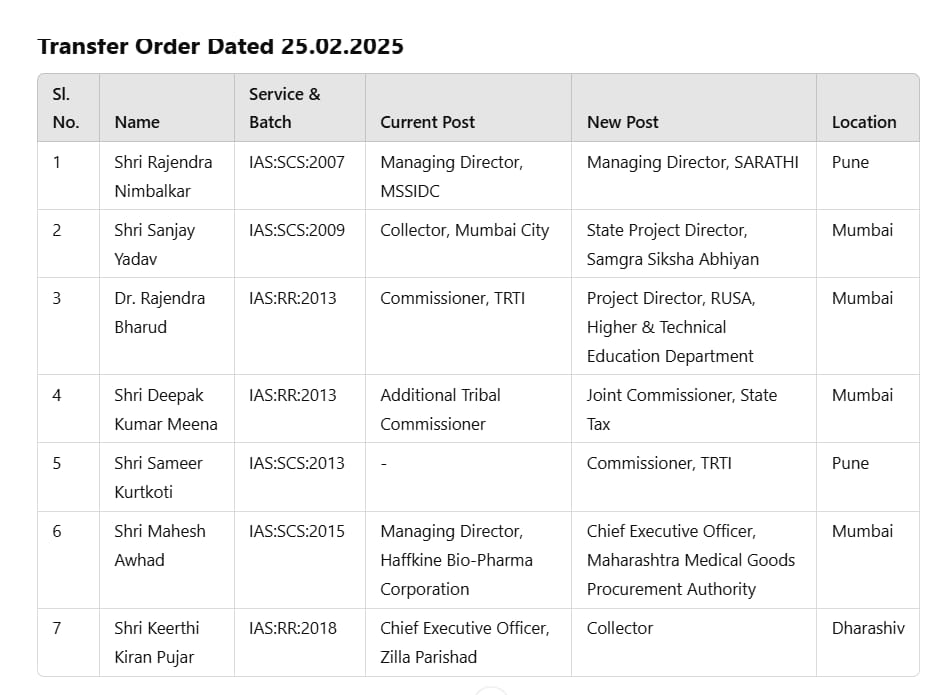 मुंबई: महाराष्ट्र सरकार ने 7 IAS अधिकारियों के तबादला आदेश जारी किए हैं। इन तबादला आदेश में दो कलेक्टर भी प्रभावित हुए हैं।