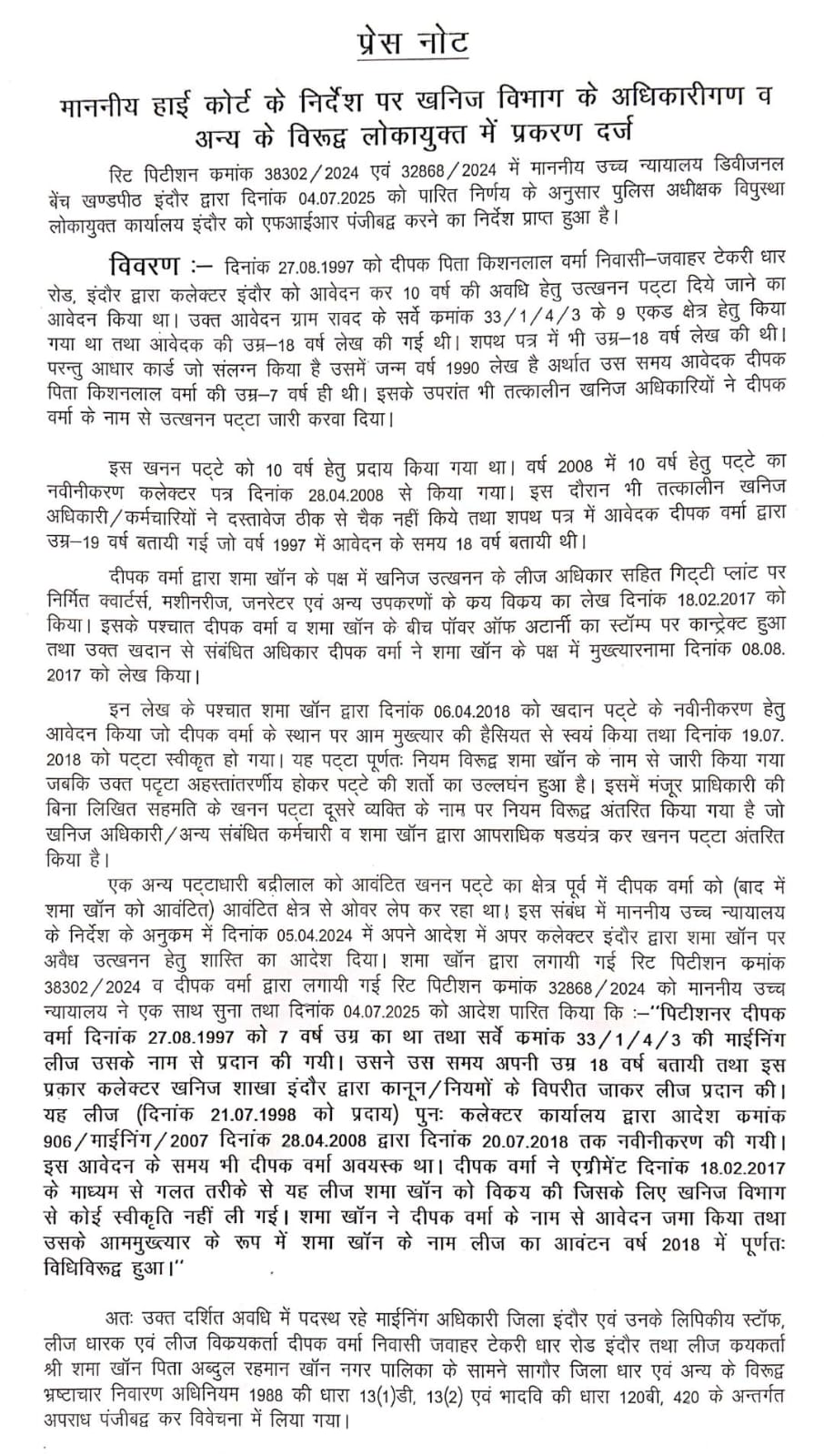 तत्कालीन अधिकारियों ने 1997 में जब खदान आवंटन की थी। उस समय आवेदन में दीपक वर्मा की उम्र 18 वर्ष बताई गई। जबकि, लगाए गए दस्तावेजों में उसकी वास्तविक उम्र 7 वर्ष ही थी। 1998 में नवीनीकरण के समय भी आवेदन में उम्र 19 वर्ष अंकित की गई। इस तरह एक बच्चे को खदान का आवंटन हो गया और खनिज विभाग के अधिकारियों और कर्मचारियों ने उस पर ध्यान नहीं दिया। हाई कोर्ट ने माना कि यह अधिकारियों की मिलीभगत के बिना असंभव है, इसलिए कोर्ट में लोकायुक्त को खनिज अधिकारियों के खिलाफ एफआईआर करने के निर्देश दिए है।