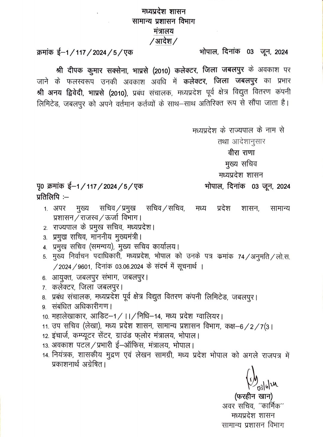भोपाल: जबलपुर कलेक्टर दीपक सक्सेना बेटे के आकस्मिक निधन के बाद अवकाश पर हैं। उनकी अवकाश अवधि में कलेक्टर जबलपुर का प्रभार अनय द्विवेदी प्रबंध संचालक मध्य प्रदेश पूर्व क्षेत्र विद्युत वितरण कंपनी लिमिटेड जबलपुर को अपने वर्तमान दायित्व के साथ-साथ अतिरिक्त रूप से सौंपा गया है। द्विवेदी 2010 बैच के IAS अधिकारी हैं।