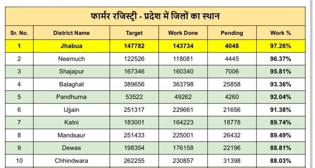 जिले को दिए गए लक्ष्य 1.47 लाख फॉर्मर रजिस्ट्री के विरुद्ध झाबुआ जिले के राजस्व विभाग ने लगभग 1.43 लाख पंजीकरण पूर्ण कर लिए हैं।