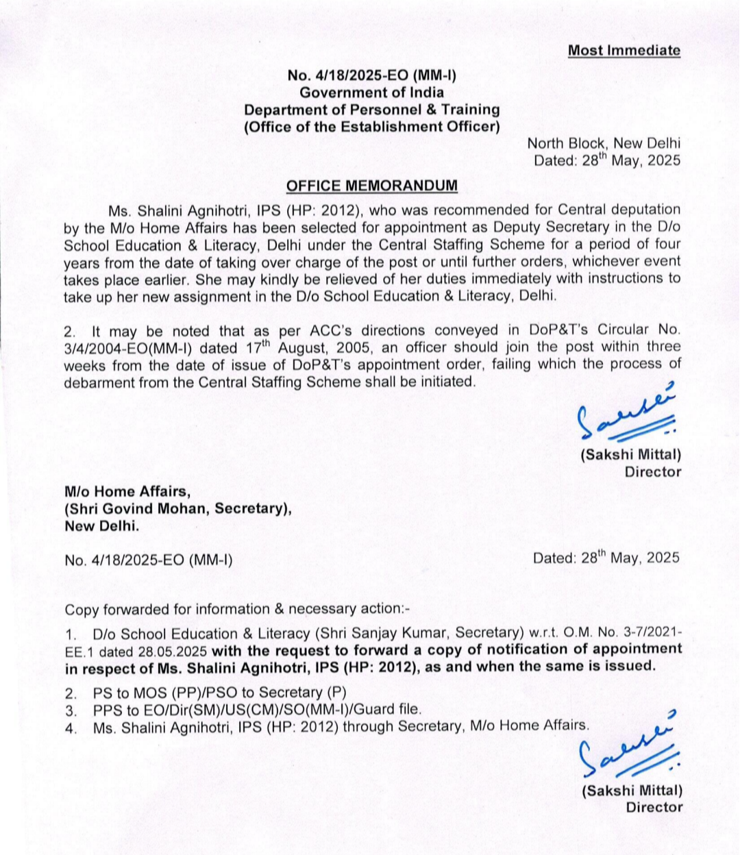 DoPT द्वारा 25 मई 2025 को जारी आदेश के अनुसार शालिनी अग्निहोत्री (IPS) को शिक्षा मंत्रालय के तहत स्कूल शिक्षा और साक्षरता विभाग में उप सचिव के पद पर नियुक्ति के लिए चुना गया है। शालिनी हिमाचल प्रदेश कैडर की 2012 बैच की भारतीय पुलिस सेवा (IPS) अधिकारी हैं और हिमाचल प्रदेश के धर्मशाला में पुलिस अधीक्षक कांगड़ा के पद पर तैनाती के बाद केंद्र सरकार में पदस्थ की गई है।