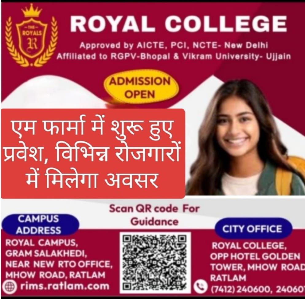 रॉयल कॉलेज, रतलाम में वर्तमान सत्र के लिए एम.फार्मा पाठ्यक्रम में प्रवेश प्रक्रिया प्रारंभ हो चुकी है। इच्छुक विद्यार्थियों की सहायता हेतु एक हेल्प डेस्क स्थापित की गई हैं, जहां उन्हें प्रवेश प्रक्रिया, करियर मार्गदर्शन, काउंसलिंग विकल्प एवं प्लेसमेंट संबंधित समस्त जानकारी उपलब्ध कराई जाती हैं!