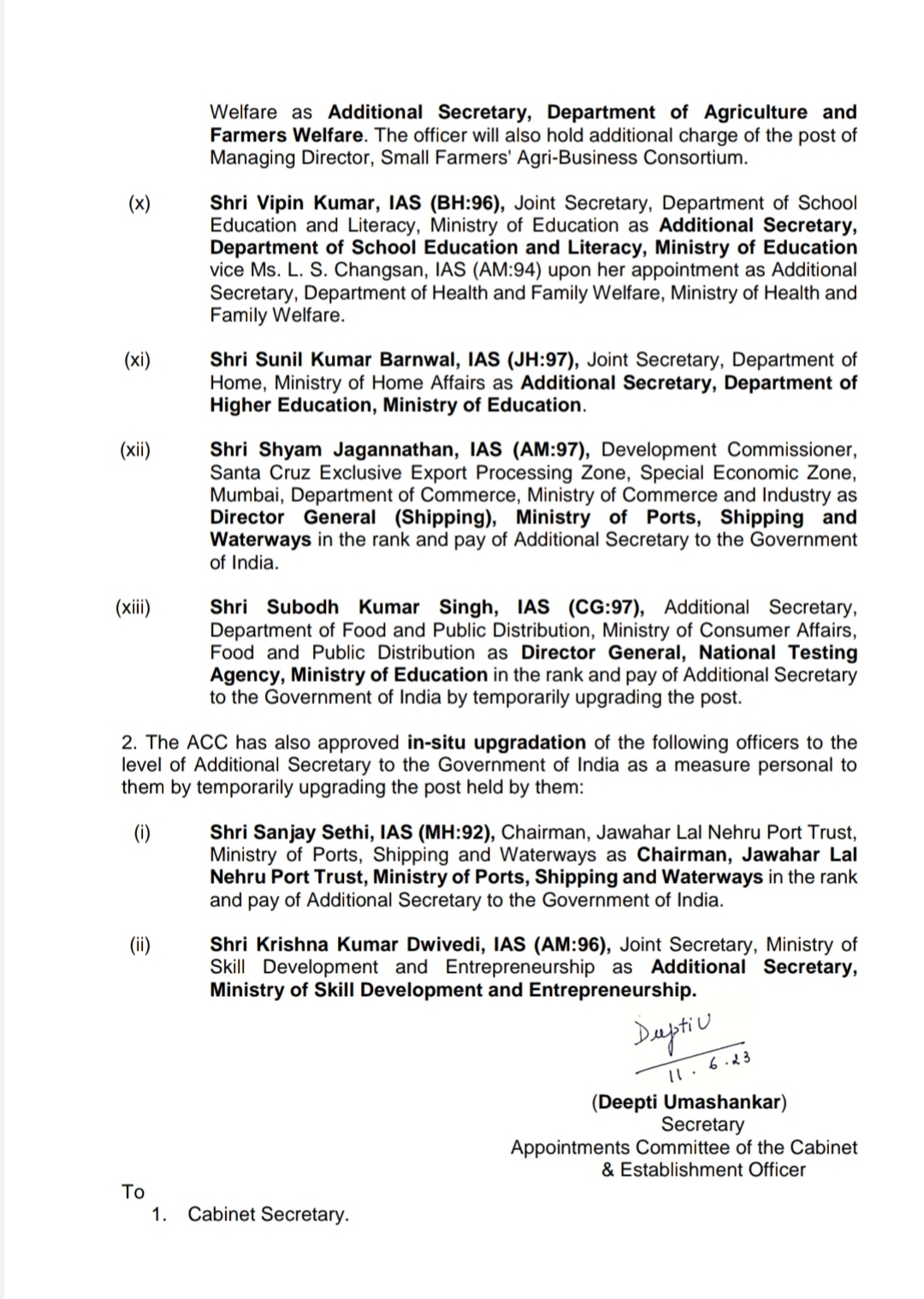 92 बैच के IAS अधिकारी विमलुनमंग व्यूलनाम को इकोनामिक अफेयर्स विभाग में एडीशनल सेक्रेट्री, इसी बैच के IRS अधिकारी रमेश कृष्णमूर्ति को श्रम और रोजगार मंत्रालय में एडिशनल सेक्रेटरी,93 बैच के छत्तीसगढ़ कैडर के IAS अधिकारी अमित अग्रवाल को चीफ एग्जीक्यूटिव ऑफिसर यूनीक आईडेंटिफिकेशन अथॉरिटी आफ इंडिया, छत्तीसगढ़ कैडर की 94 बैच की अधिकारी रिचा शर्मा को फूड और पब्लिक डिस्ट्रीब्यूशन विभाग में एडीशनल सेक्रेटरी, एलएस जांगसान को हेल्थ और फैमिली वेलफेयर विभाग में एडिशनल सेक्रेटरी, 1995 के छत्तीसगढ़ कैडर के आईएएस मनिंदर कौर द्विवेदी को कृषि और किसान कल्याण विभाग में एडीशनल सेक्रेटरी, बिहार कैडर के 96 बैच के अधिकारी विपिन कुमार को स्कूल शिक्षा विभाग में एडिशनल सेक्रेटरी, झारखंड कैडर के 97 बैच के अधिकारी सुनील कुमार बरनवाल को उच्च शिक्षा विभाग में एडीशनल सेक्रेटरी, इसी बैच के असम केडर के श्याम जगन्नाथन को डायरेक्टर जनरल मिनिस्ट्री ऑफ पोर्ट शिपिंग एंड वॉटरवेज, इसी बैच के छत्तीसगढ़ कैडर के अधिकारी सुबोध कुमार सिंह को डायरेक्टर जनरल नेशनल टेस्टिंग एजेंसी मिनिस्ट्री ऑफ एजुकेशन, महाराष्ट्र कैडर के 92 बैच के अधिकारी संजय सेठी हो चेयरमैन जवाहरलाल नेहरू पोर्ट ट्रस्ट मिनिस्ट्री ऑफ पोर्ट, शिपिंग एंड वॉटरवेज और 96 बैच के अधिकारी कृष्ण कुमार द्विवेदी को जॉइंट सेक्रेटरी से एडीशनल सेक्रेट्री मिनिस्ट्री ऑफ स्किल डेवलपमेंट एंड एंटरप्रेन्योरशिप बनाया गया है।