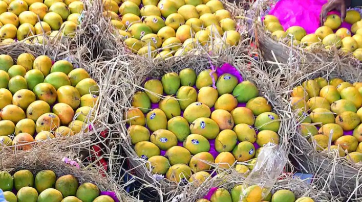 Indore : देवी अहिल्याबाई फल और सब्जी मंडी में इस वक्त करीब आधे दाम पर आमों की बिक्री हो रही है। फल विक्रेता 20-20 रुपये प्रति किलो में हापुस, लंगड़ा, तोतापरी और दशहरी जैसे आम बेच रहे हैं। फल व्यापारियों का कहना है कि बरसात के मौसम और मंडी में आए कई टन आम की वजह से आम के दाम बहुत ज्यादा गिर गए और इन्हें सस्ते दामों पर बेचा जा रहा है।