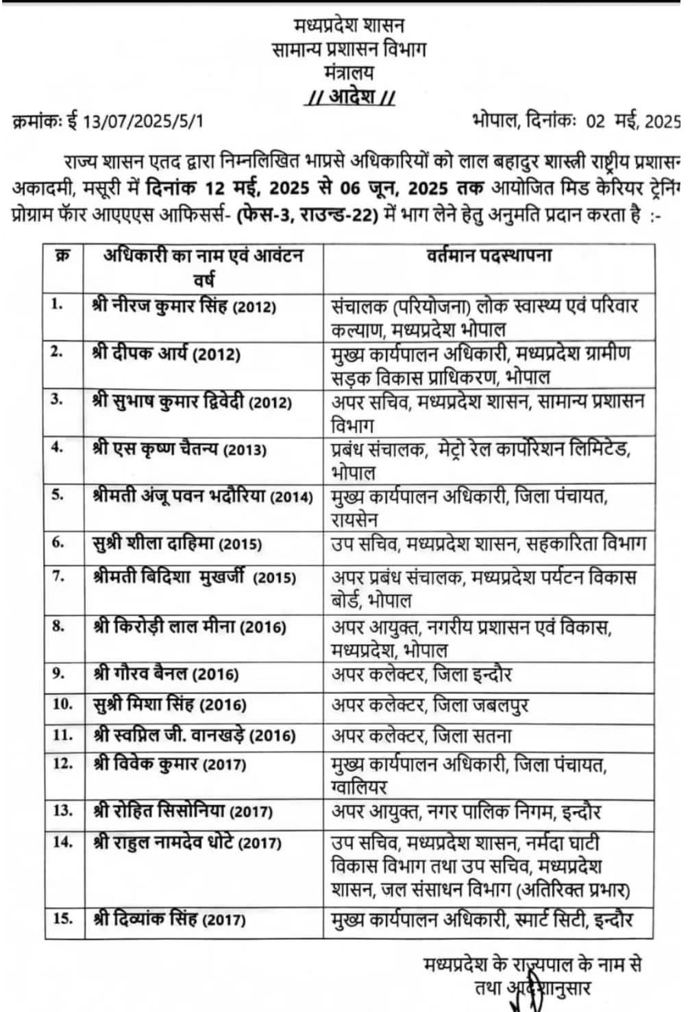 भोपाल: Mid Career Training programme for IAS Officers: MP के 2012 से 2017 बैच के 15 IAS अधिकारी मसूरी स्थित लाल बहादुर शास्त्री राष्ट्रीय प्रशासन अकादमी में ट्रेनिंग लेंगे। यह ट्रेनिंग 12 मई से 6 जून 2025 तक आयोजित की गई है।