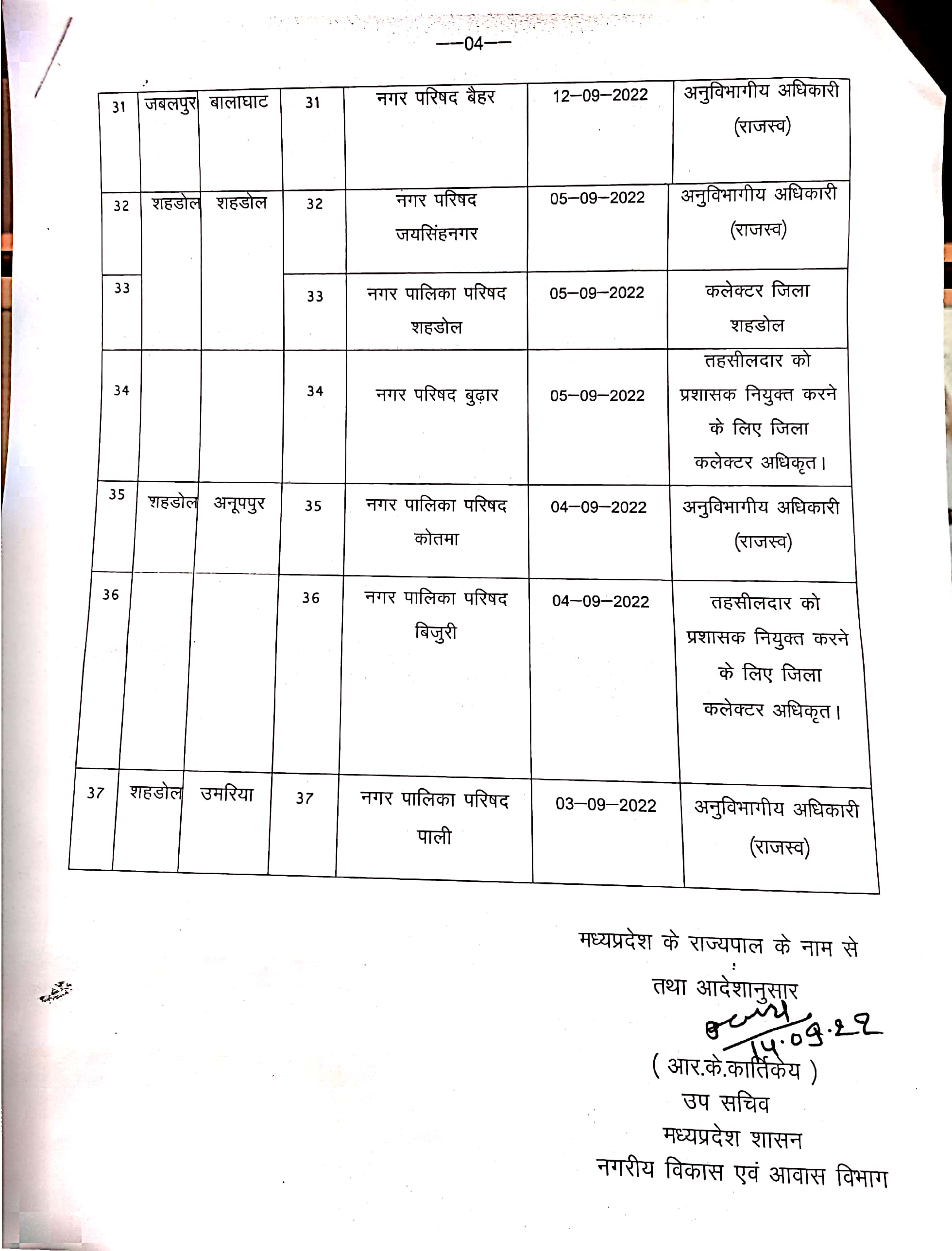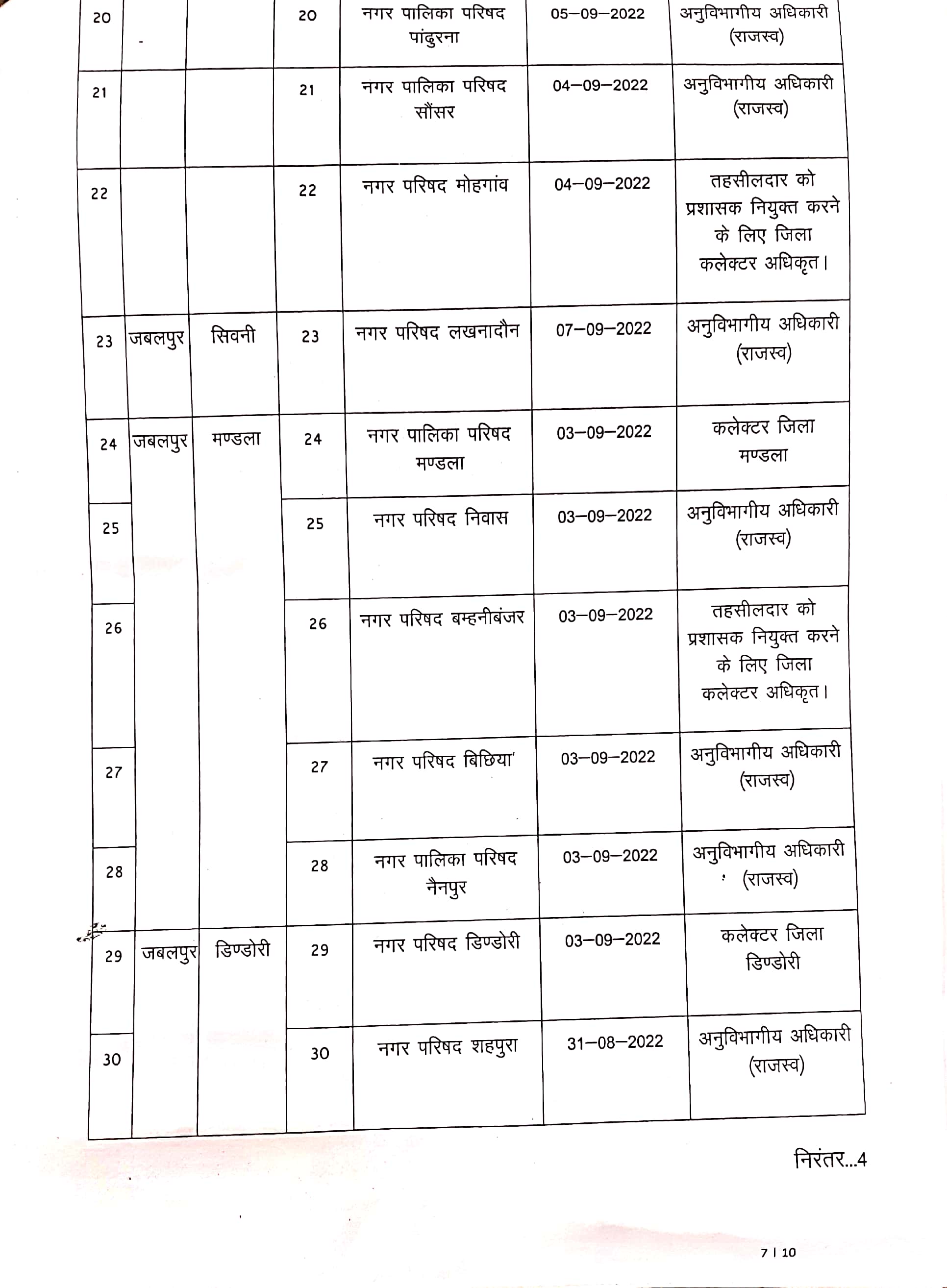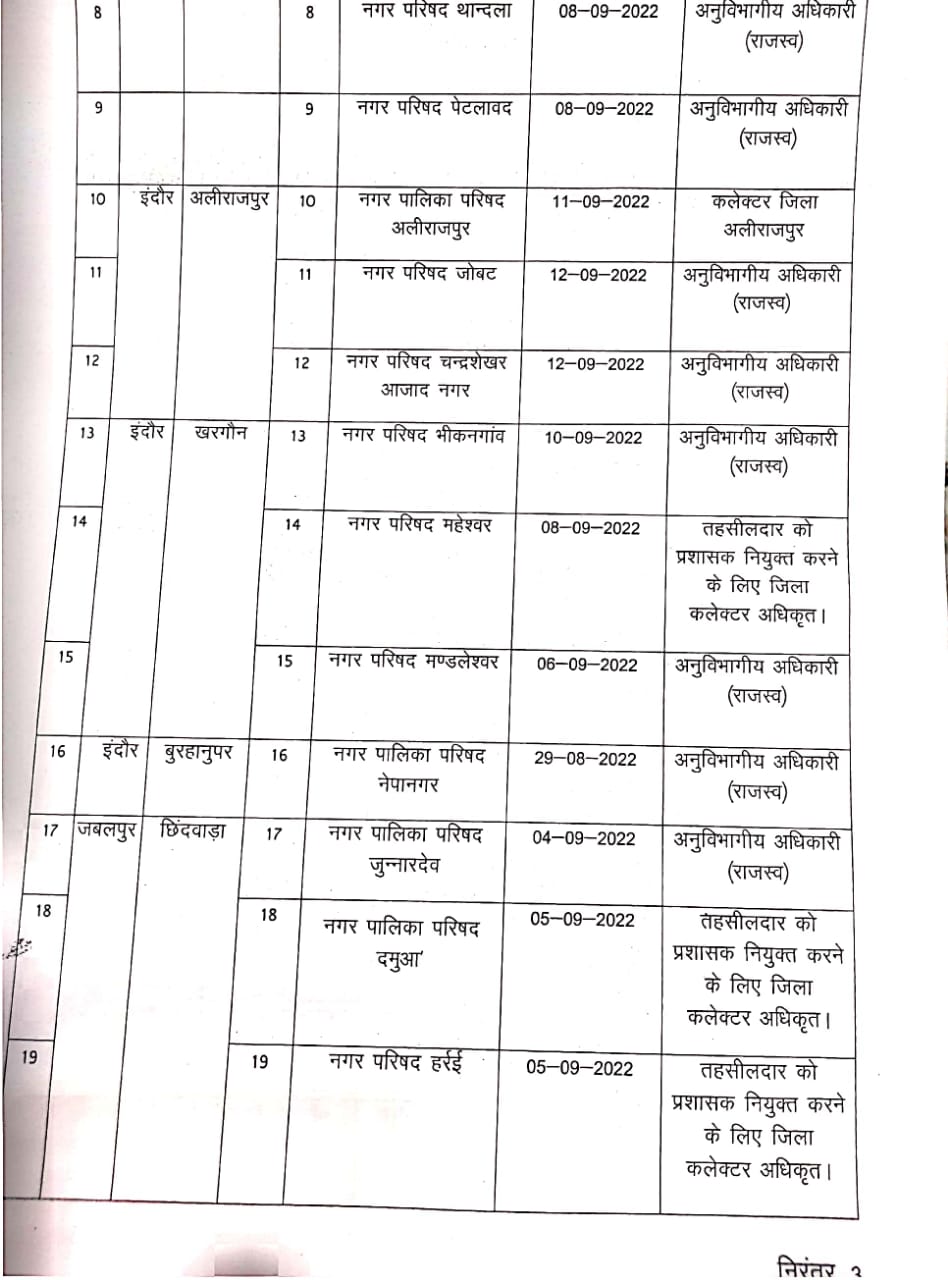 भोपाल: राज्य शासन ने आज एक आदेश जारी कर प्रदेश की 30 नगर निकायों में परिषद का कार्यकाल पूर्ण होने पर प्रशासक नियुक्त कर दिए हैं।