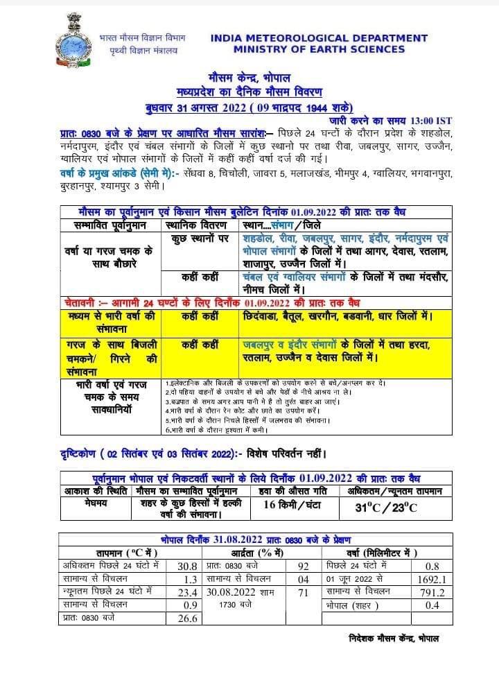 बुधवार को प्रदेश में इंदौर, शहडोल, रीवा, जबलपुर, सागर, नर्मदापुरम एवं भोपाल संभाग के जिलों में हल्की बूंदाबांदी होने की संभावना जताई गई। वहीं राजगढ़, सीहोर, शाजापुर, देवास और भोपाल संभाग के जिलों तथा श्योपुरकलां, बैतूल, ग्वालियर, शिवपुरी, छिंदवाड़ा, जबलपुर, सागर, शाजापुर, दमोह, देवास, नरसिंहपुर ,जबलपुर, सिवनी, कटनी, नर्मदापुरम जिलों में भारी बारिश की संभावना है।