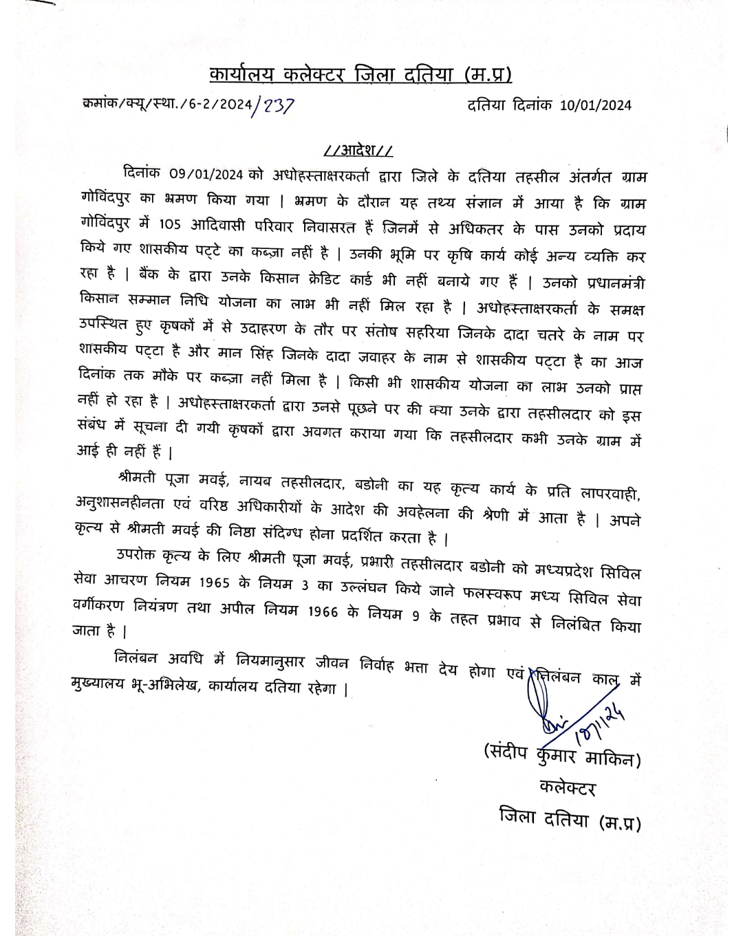 भोपाल: मध्य प्रदेश के दतिया जिले में कलेक्टर संदीप कुमार माकिन ने नायब तहसीलदार श्रीमती पूजा मवई को सस्पेंड कर दिया है।