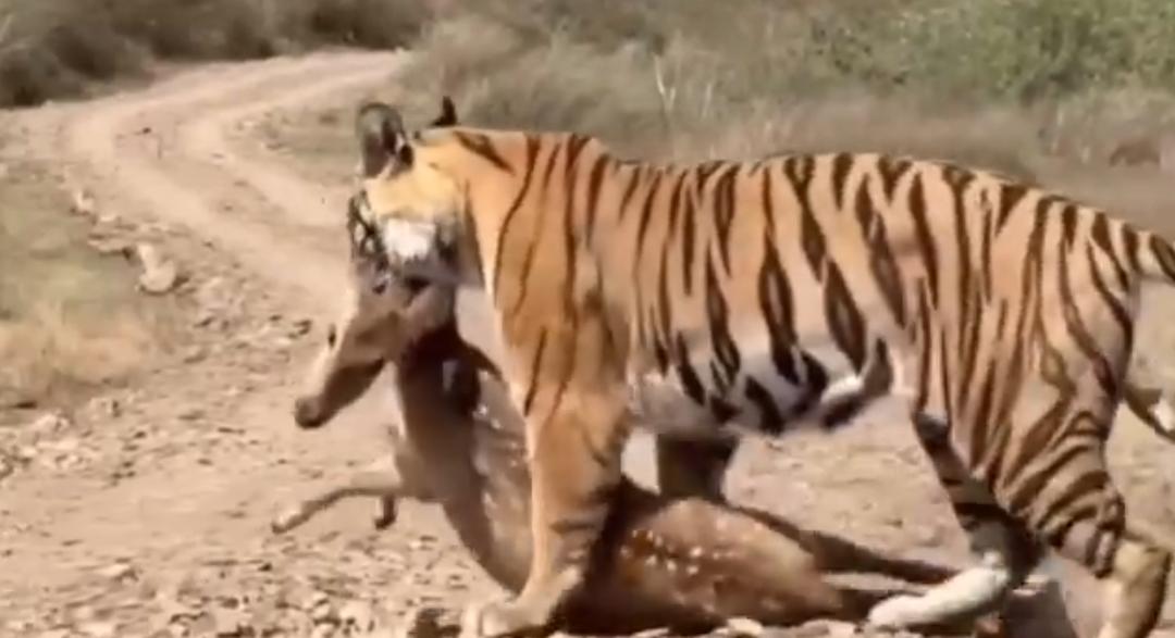 इस वीडियो में आप देख सकते हैं कि बाघ ने हिरण को अपने मुंह में दबोच रखा है और इस फिराक में है कि उसे कहां ले जाकर भोजन बनाऊं!