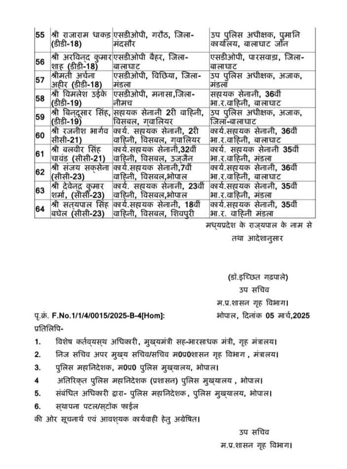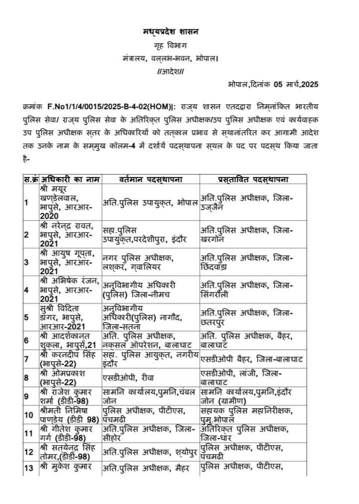 भोपाल: राज्य शासन में आज 8 IPS सहित 68 पुलिस अफसर के तबादले आदेश जारी किए हैं। भोपाल के ACP मयूर खंडेलवाल उज्जैन के ASP बनाए गए हैं।