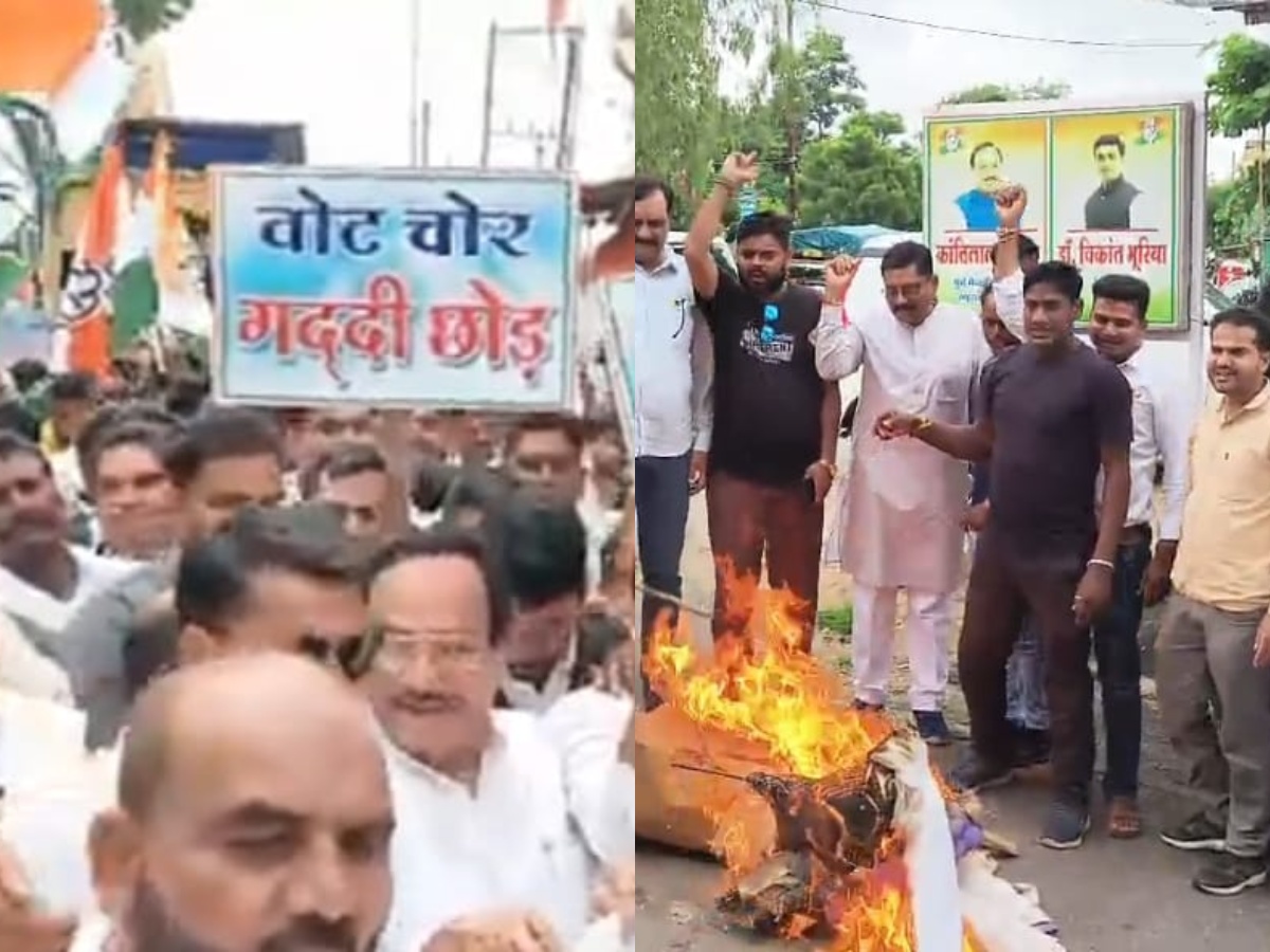 झाबुआ में राजनीतिक घमासान: कांग्रेस की “वोट चोर गद्दी छोड़” रैली, भाजपा ने किया राहुल गांधी का पुतला दहन