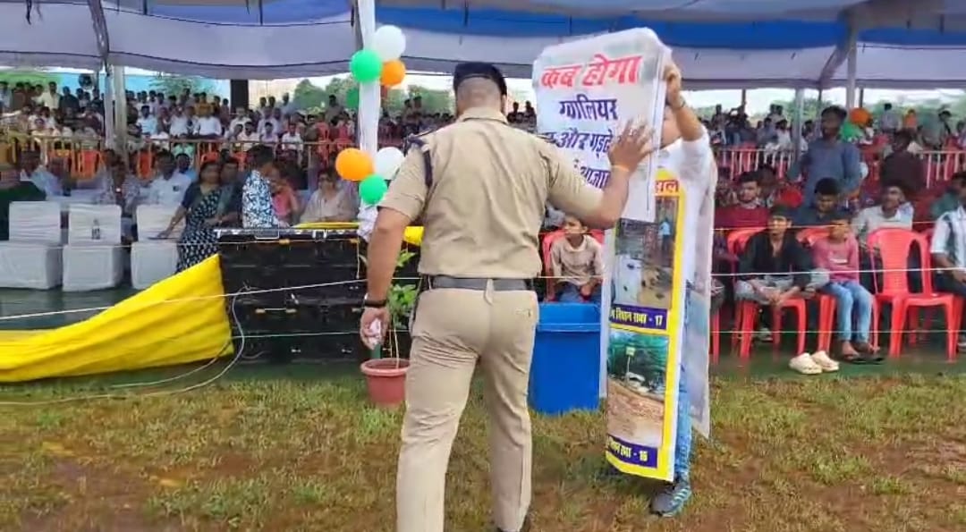 कार्यक्रम में जब मंत्री नारायण सिंह कुशवाह का भाषण चल रहा था। उसके बाद ही विजय माहोर नाम का व्यक्ति अपने शरीर पर ग्वालियर शहर की गड्ढे वाली सड़कों से निजात दिलाने के पोस्टर लगाकर पहुंच गया।