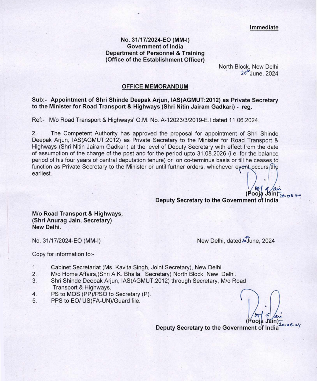 नई दिल्ली: भारतीय प्रशासनिक सेवा में AGMUT कैडर के 2012 बैच के IAS अधिकारी केंद्रीय रोड ट्रांसपोर्ट एंड हाइवेज मंत्री नितिन गडकरी के प्राइवेट सेक्रेटरी (PS) बनाए गए हैं। उनका यह सेंट्रल डेपुटेशन 4 साल के लिए है। वे केंद्र सरकार में उप सचिव स्तर के अधिकारी रहेंगे।