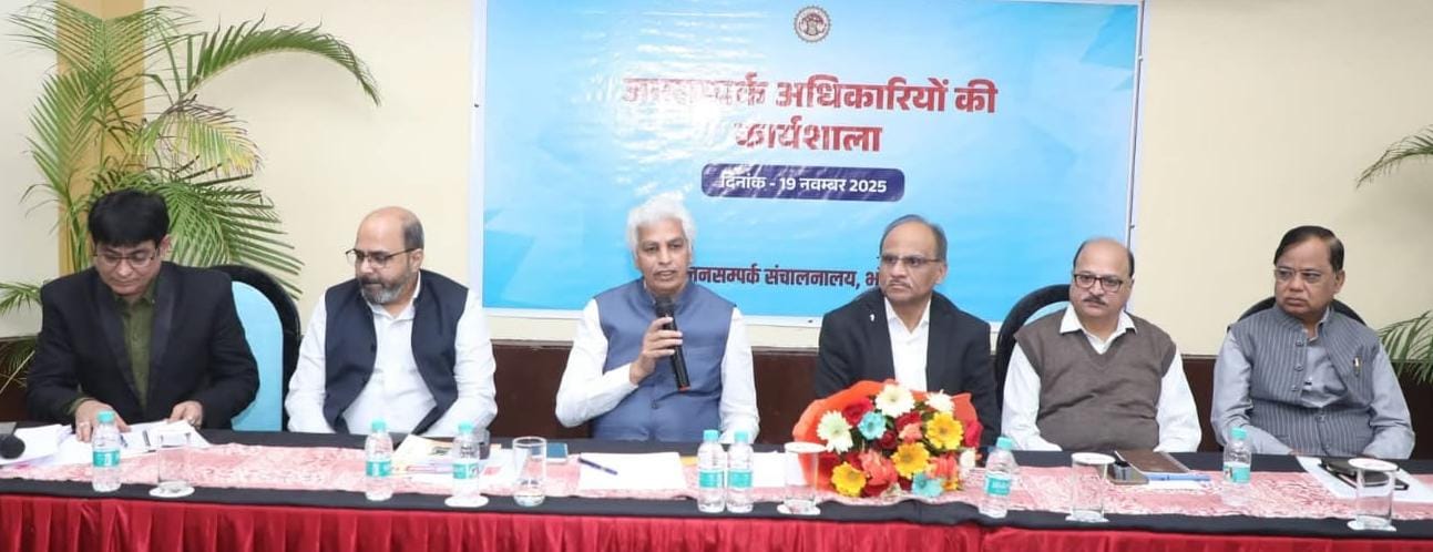 जनसंपर्क आयुक्त श्री सक्सेना बुधवार को होटल अशोका लेक व्यू में जनसंपर्क अधिकारियों की राज्य स्तरीय एक दिवसीय कार्यशाला को संबोधित कर रहे थे. कार्यशाला में अपर संचालक जी. एस. वाधवा एवं श्री संजय जैन संयुक्त संचालक श्री पंकज मित्तल, श्री अशोक मनवानी, श्री आर आर पटेल सहित प्रदेश के सभी संभागीय और जिला जनसंपर्क अधिकारी उपस्थित थे. कार्यशाला में प्रातः 11:00 बजे से शाम 7:00 बजे तक माइंड स्टॉर्मिंग सेशन हुए, जिनमें आयुक्त जनसंपर्क ही सक्सेना और विषय विशेषज्ञों द्वारा जनसंपर्क अधिकारियों से गहन संवाद किया गया.